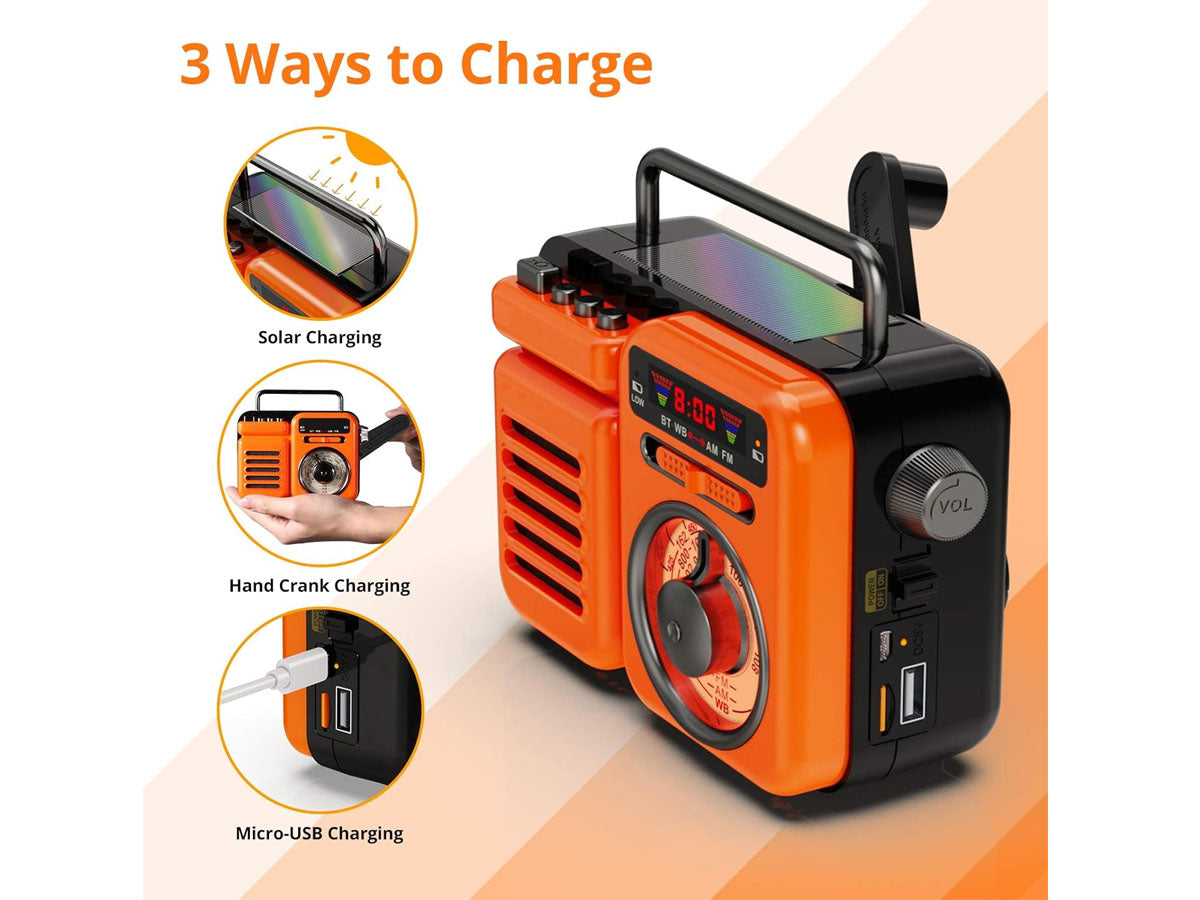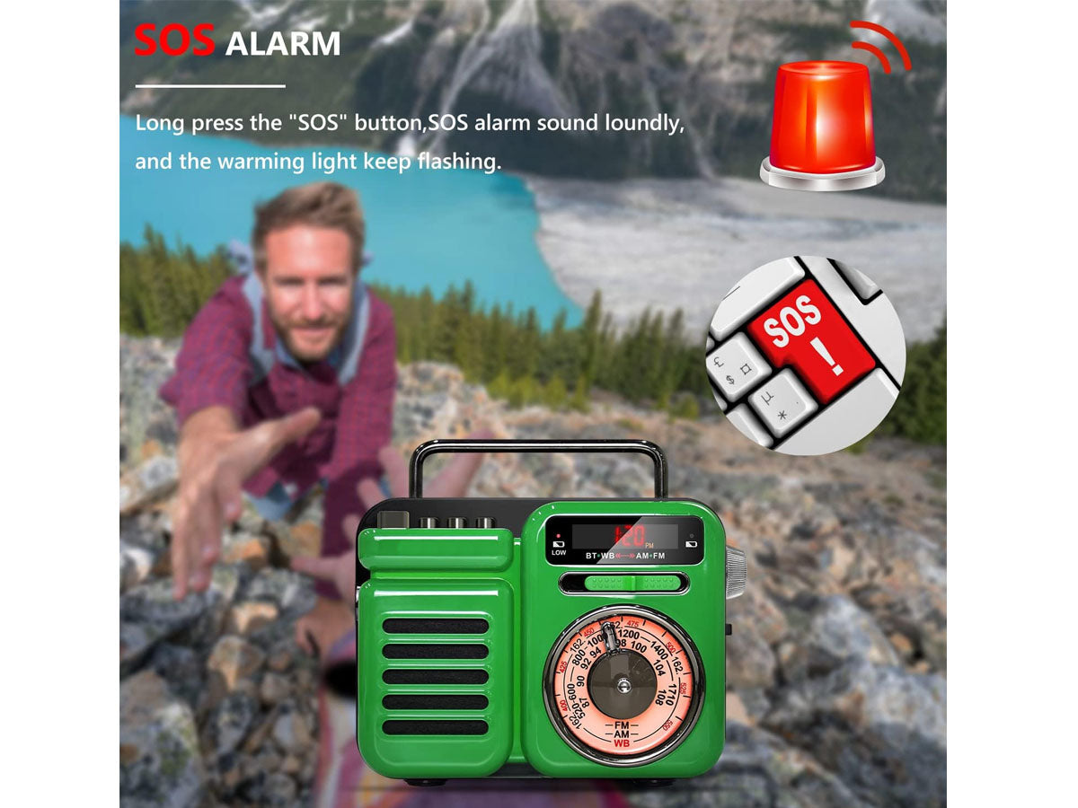 Whether hiking, camping, or facing an emergency, this Portable FM Radio Torch offers AM/FM/NOAA weather broadcasts, an SOS button for safety, and three power supply modes: hand-cranked, solar, and micro-USB charging.