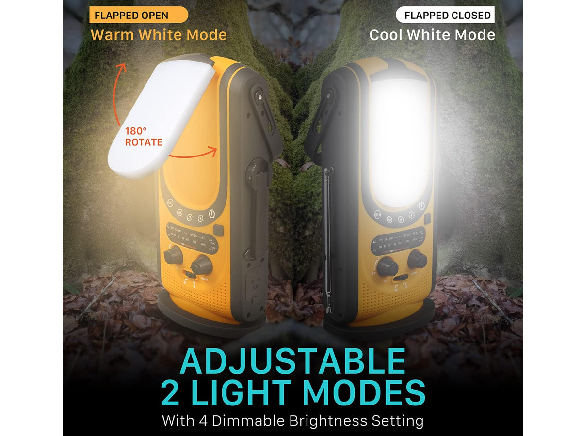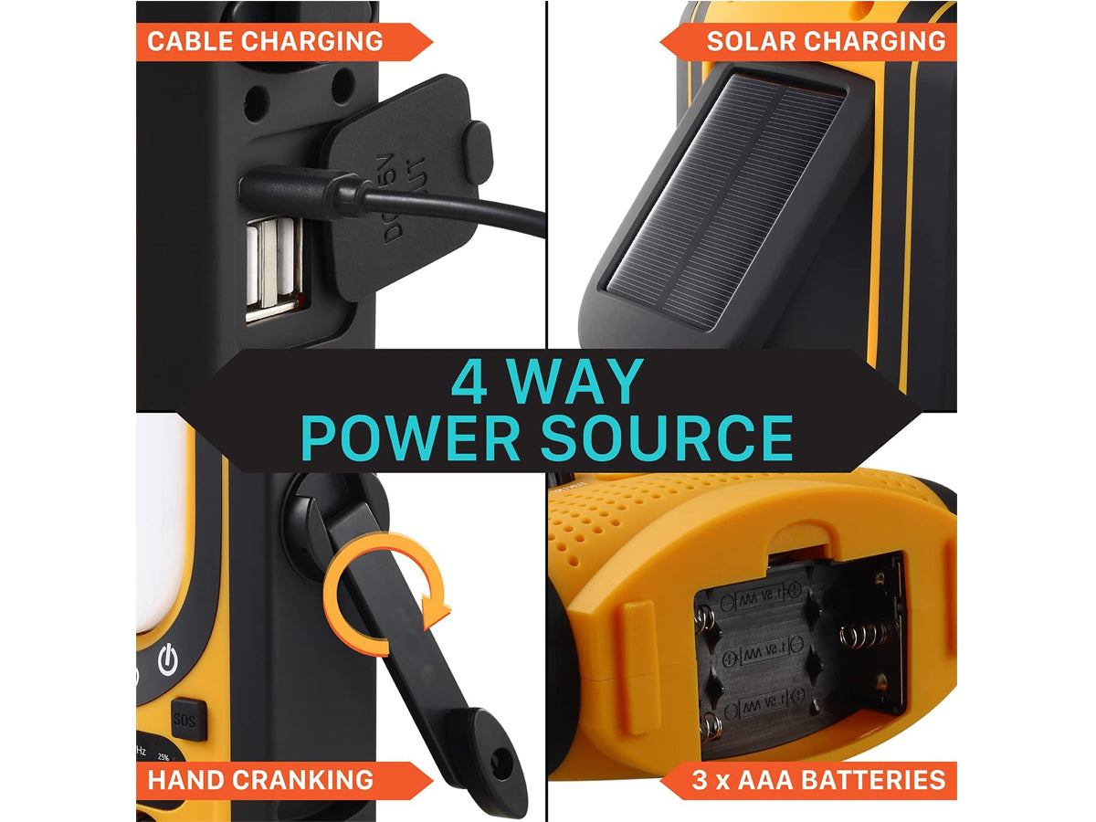 - Power Source: USB plug-in, Solar, Hand-Crank, rechargeable batteries, 3 x AAA Batteries