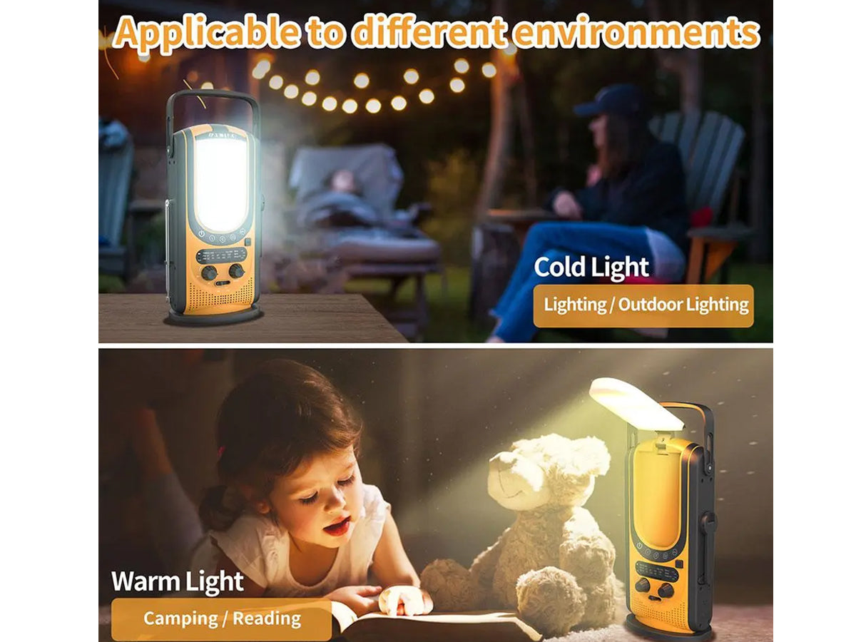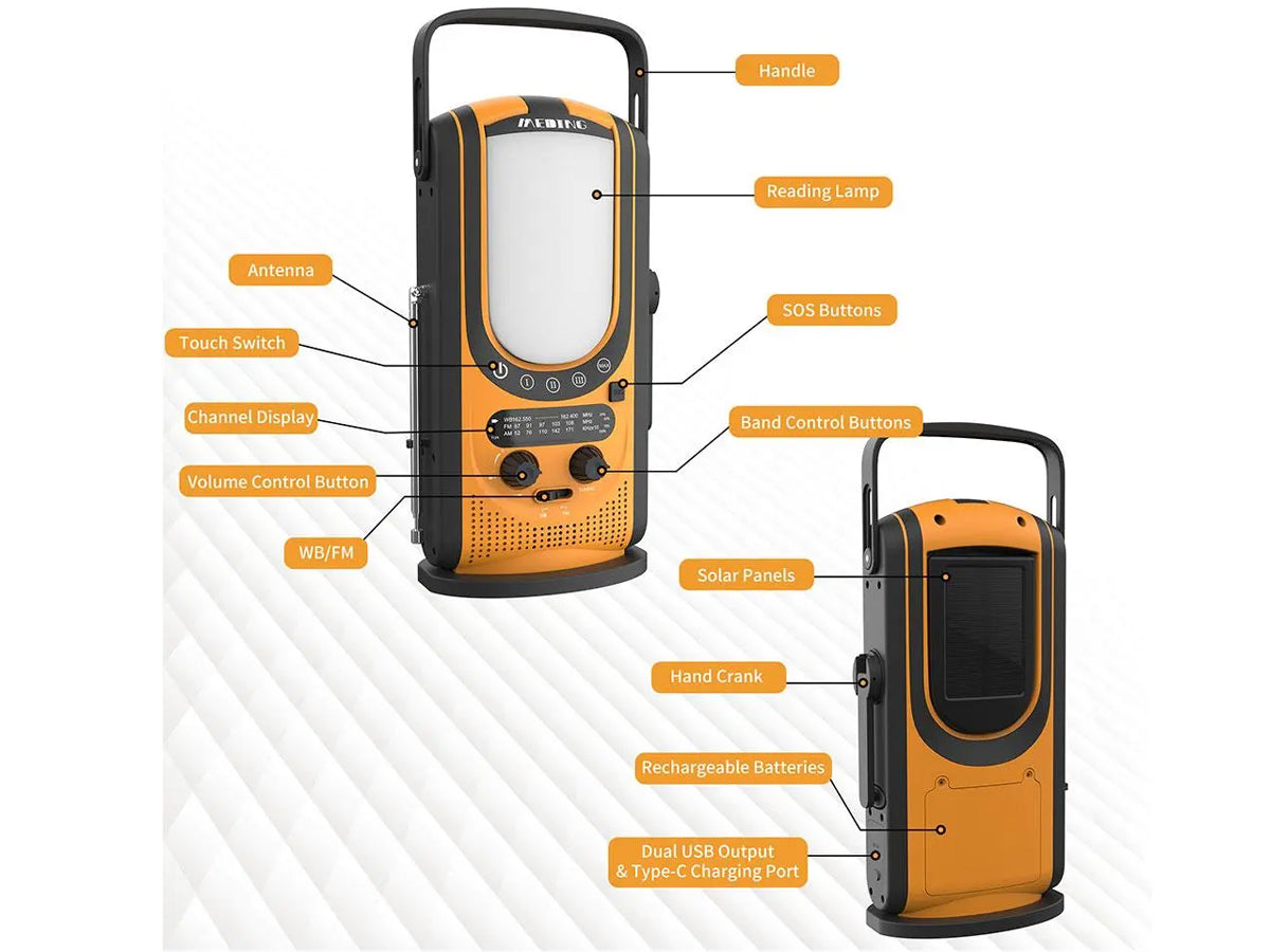 - Multifunctional FM/WB/NOAA reception and SOS alarm lamp