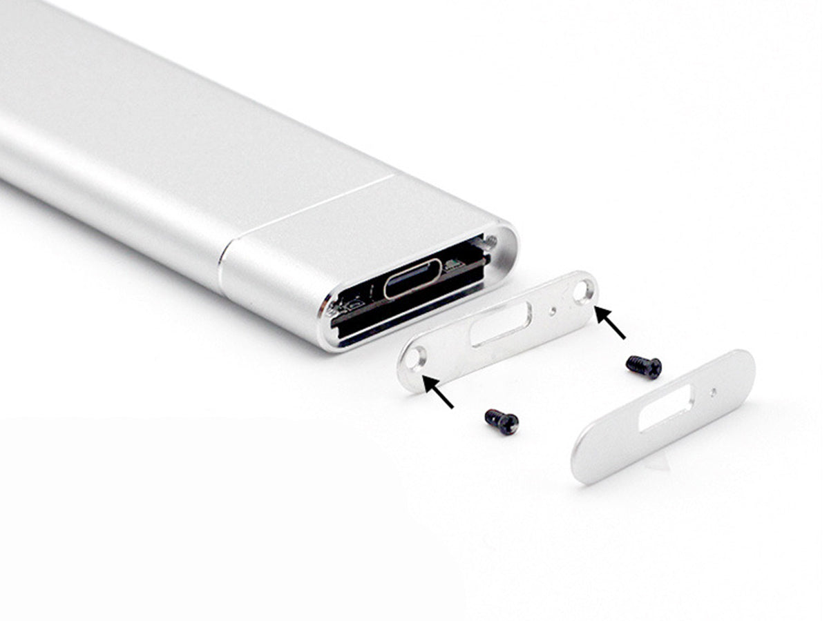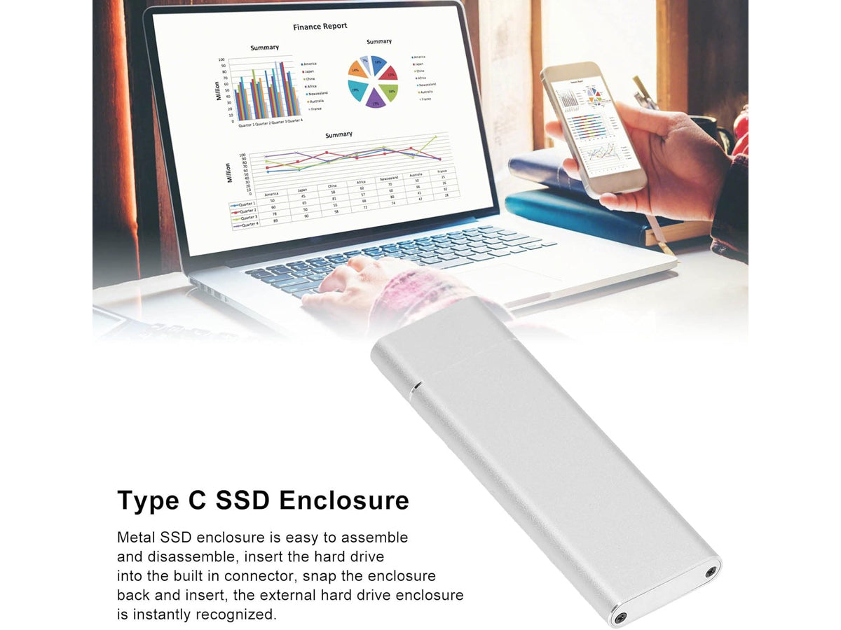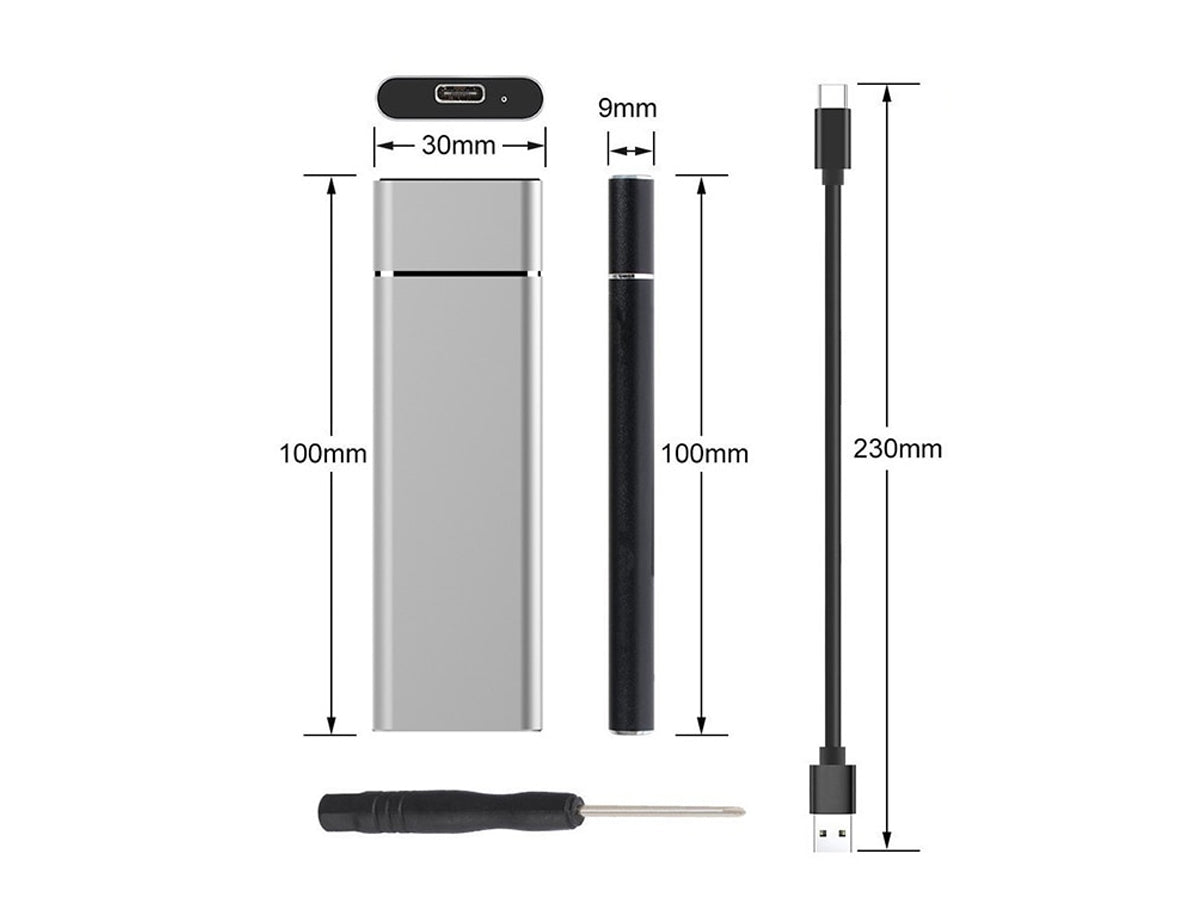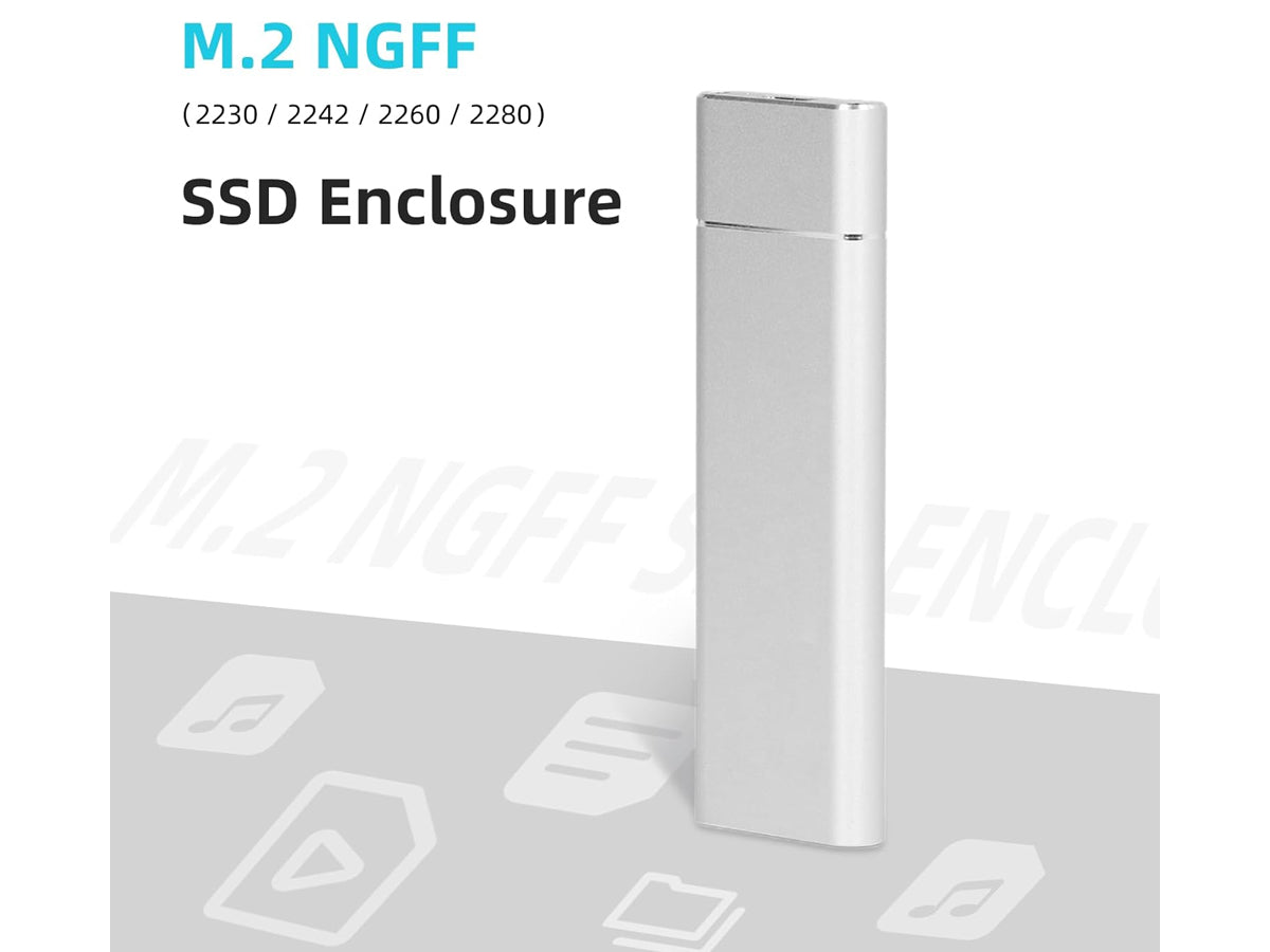 This compact size External SSD Hard Drive Enclosure Box is based on a high-speed master control chip that is compatible with M.2 NGFF SATA  in sizes 2242/2260/2280/2230, such as B-Key, BandM Key SATA / SSD. The USB-Type-C to Type-A interface supports (6Gbps) data transmission with low latency and energy-efficient