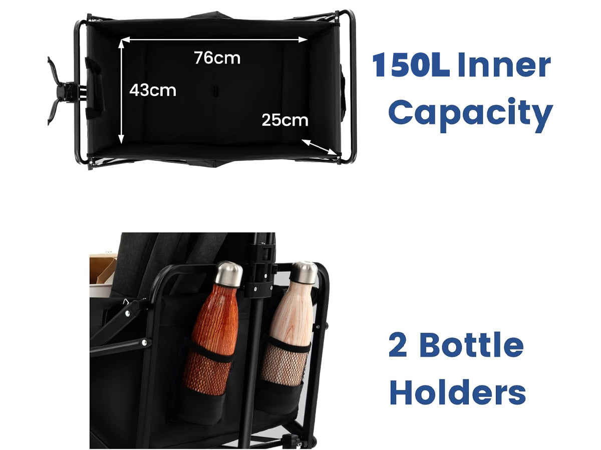 Make transporting goods a breeze with this Folding Trolley Cart, built tough with a steel frame, durable waterproof Oxford fabric, and heavy-duty rubber wheels. This Folding Trolley Cart comes with a massive 300kg weight capacity and 105L storage space, Folding Trolley Cart is perfect for camping, gardening, shopping, or everyday hauling.