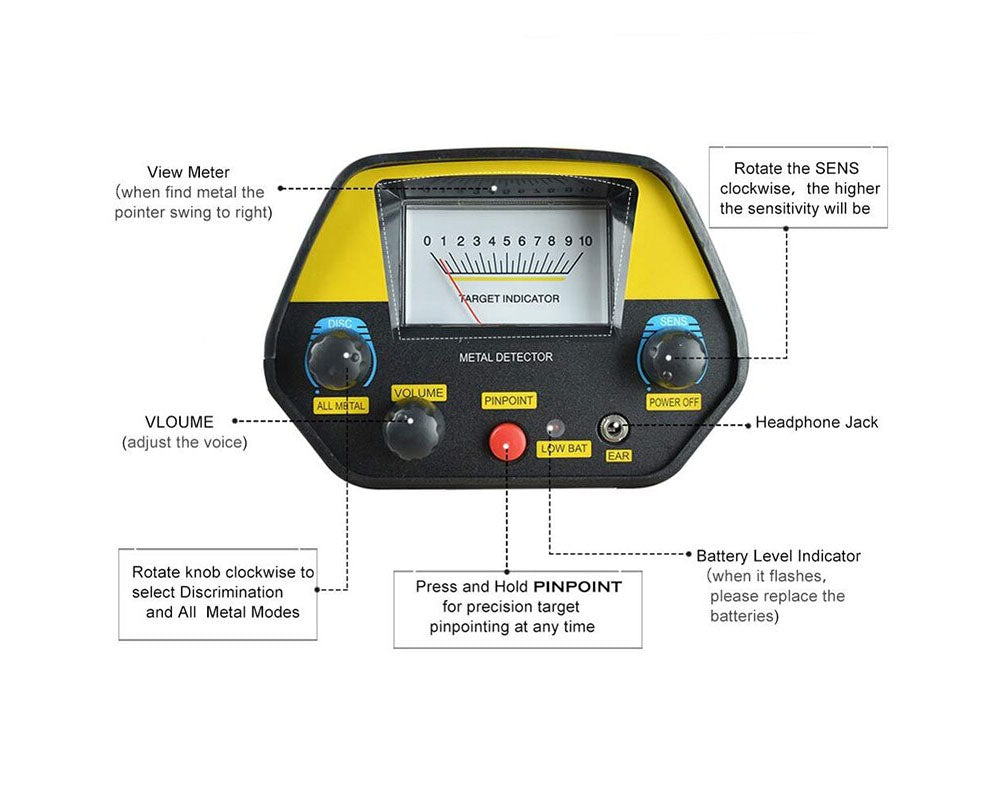 When you approach your target, the Gold Detector will beep; the movement of the pointer indicates the distance to the target material, the more the pointer moves, the closer