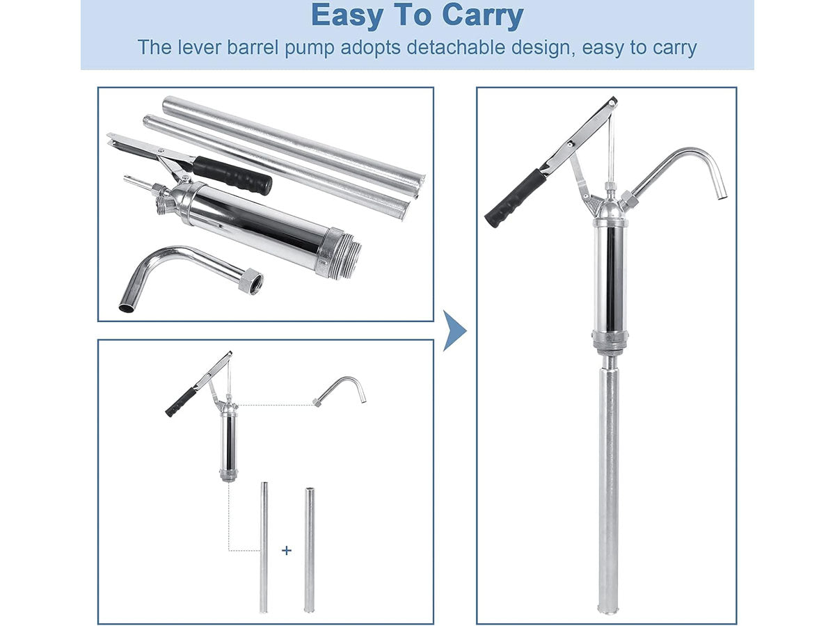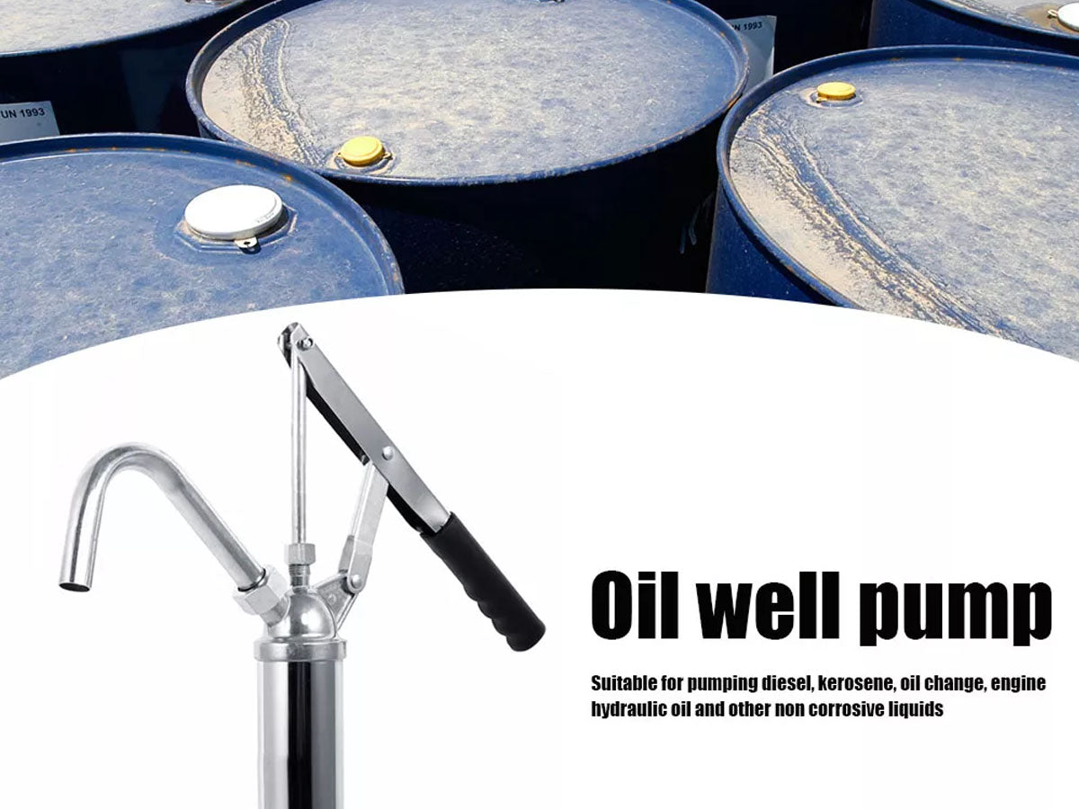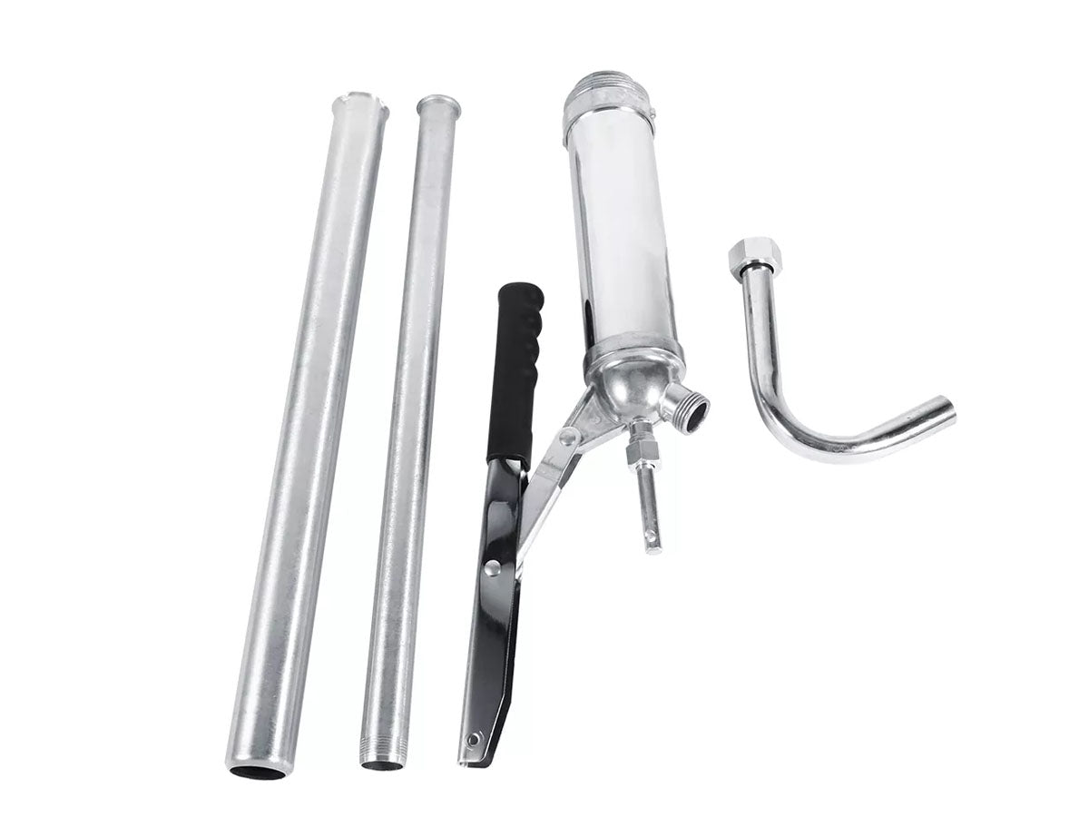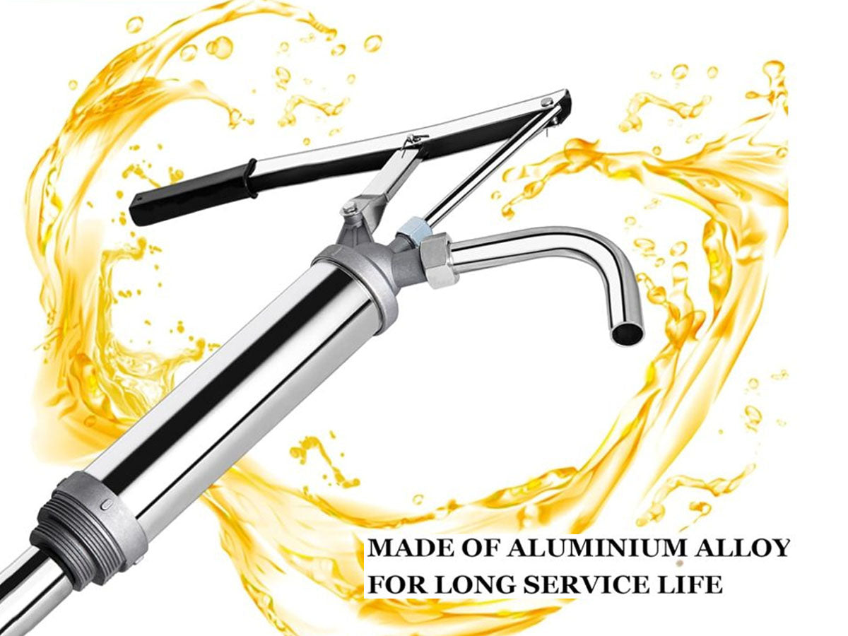 This lever-action Hand Oil Pump with a self-adjusting telescoping suction tube for flexible dispensing and operations. Oil inlet pipe with 4-semi circular intakes prevents liquid from clogging. This detachable barrel Hand Oil Pump is very easy to connect, the removable metal nozzle with thread fits easily on the hose and bends allow convenience for use.