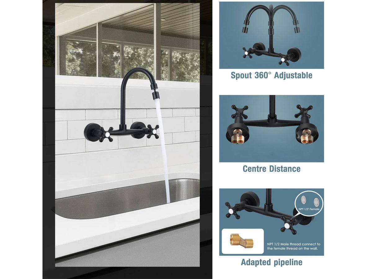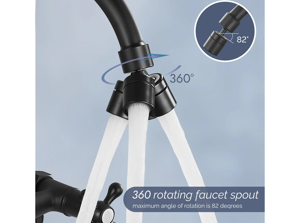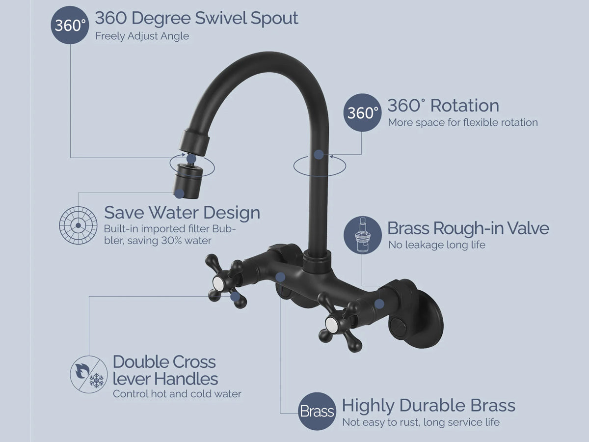 Elevate your kitchen experience with this Kitchen Mixer Tap. Crafted from solid brass, it offers superior corrosion resistance and durability. The double cross lever handles provide precise control over hot and cold water, while the 360-degree swivel spout and powerful spray make everyday tasks effortless. Easy to install and featuring a splash-free aerated stream, this Kitchen Tap Sink Mixer is perfect for residential kitchens, offering convenience and reliability for all your cleaning and cooking needs.
