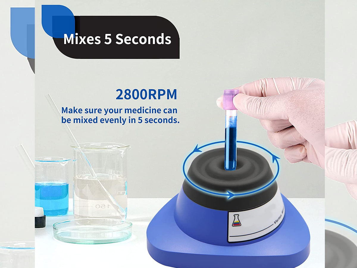 This Lab Vortex Shaker with 2800RPM durable brushless motor, just push the tube into the silicone cup head to start shaking (hold the tube in one hand); shaking stops as soon as you lift out the test tube. Mix most liquids of 50mL in 5 seconds saving you time and doing a better job too than mixing manually.