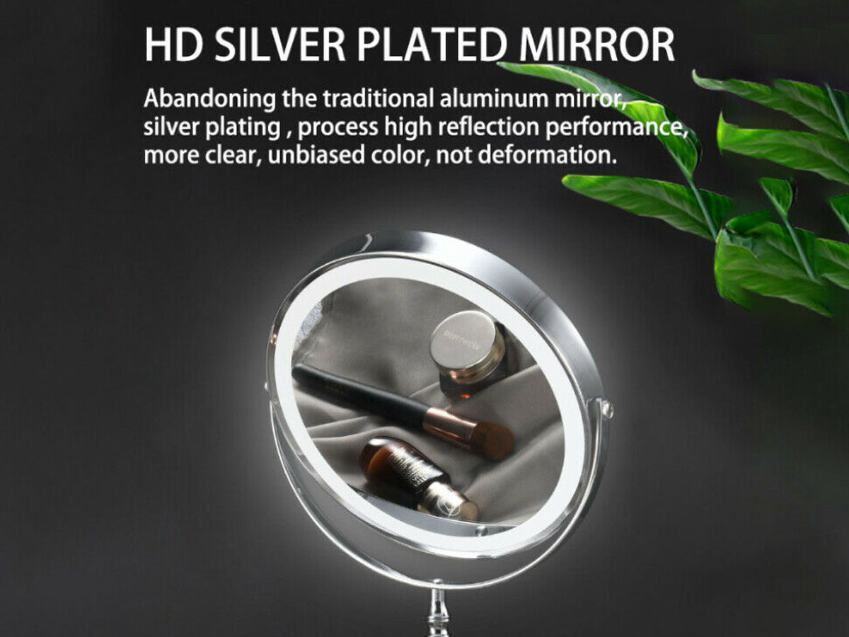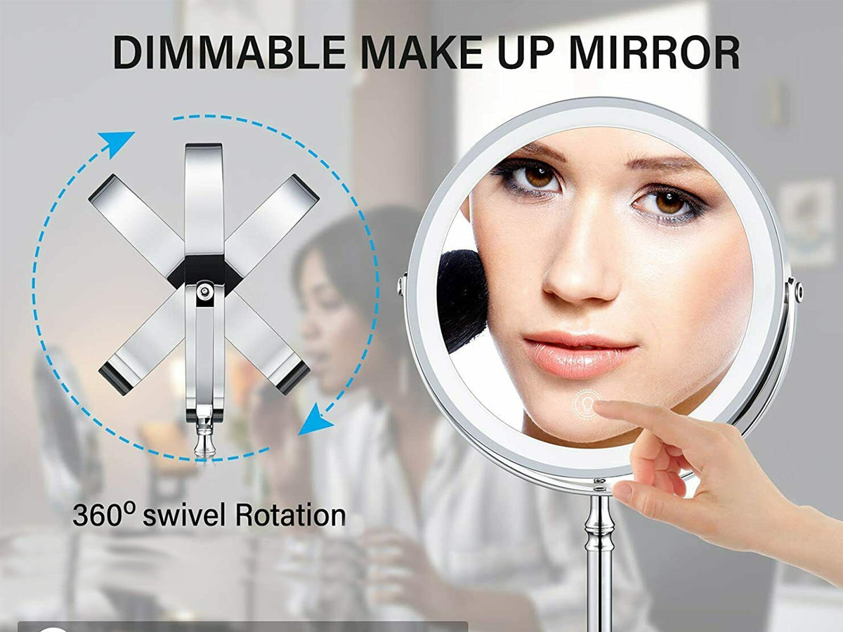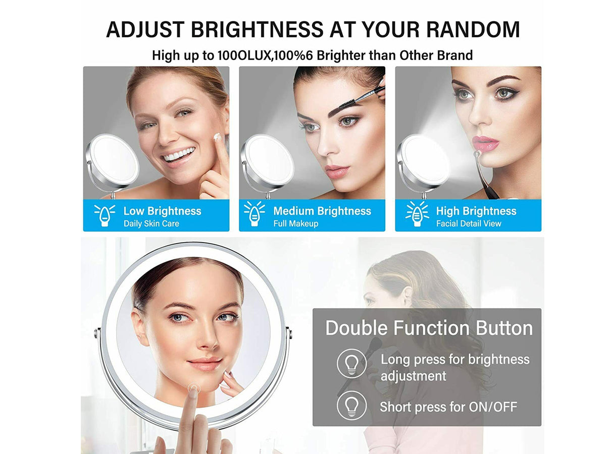 With this Double Sided LED Makeup Mirror you can move the mirror face freely to get a great view at any angle, due to the 360 ° swivel joint design. For the best view, keep a viewing distance of 6 inches. This Double-Sided LED Makeup Mirror with the brightest and best lighting system. Due to the dimmable design, you can adjust the brightness either high or low, and get whatever brightness level you prefer.