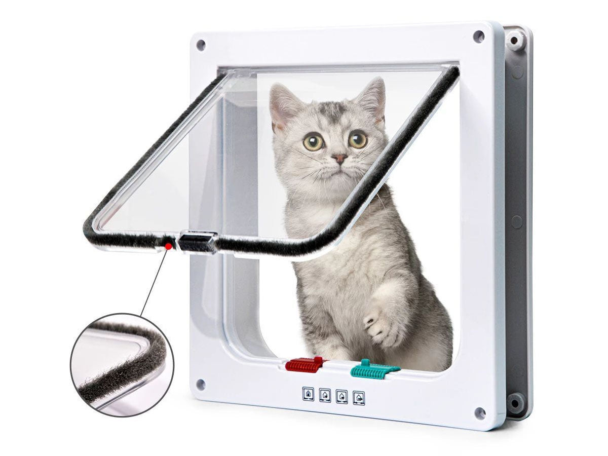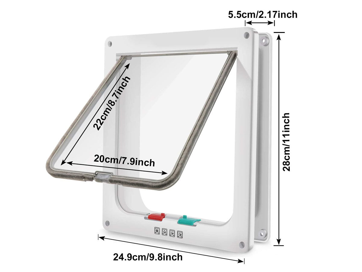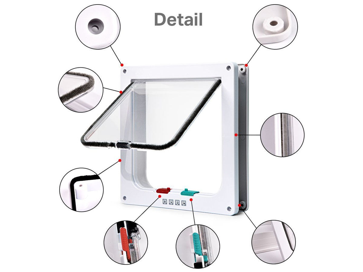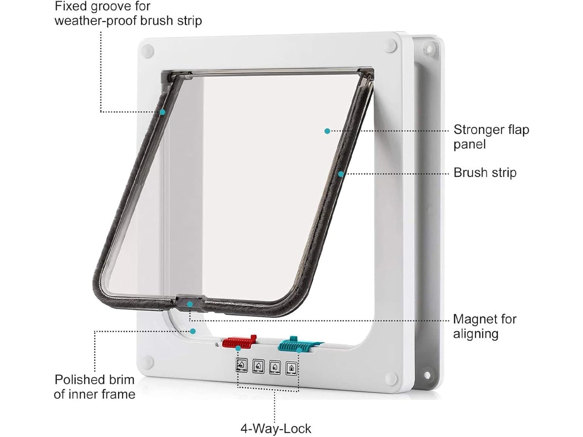 This Transparent, White coloured, Pet Flap Door is made of Durable ABS which makes it weather-resistant and Lightweight and makes it easier for your pets to push open. It has 4 Way Magnetic locking system. Only in, Only Out, In and Out Freely, Closed (if needed). With magnetic automatic closure, the pet door is very easy to control your pets in and out.