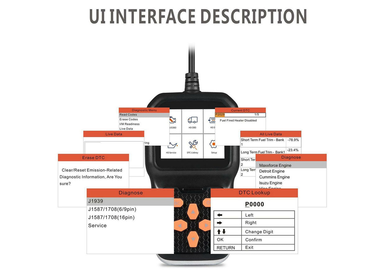 - Compatible protocols: 9 types OBD-II, J1939, J1708