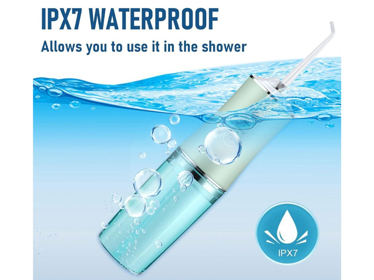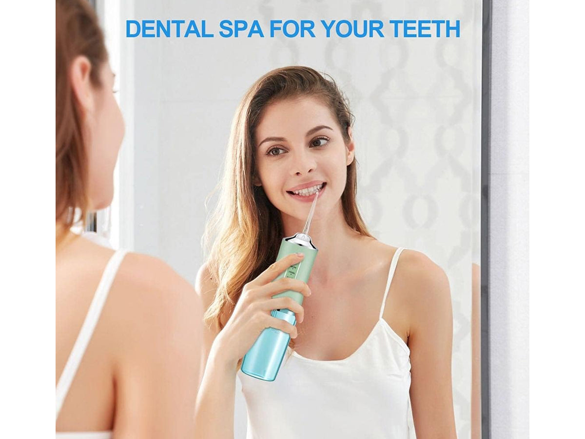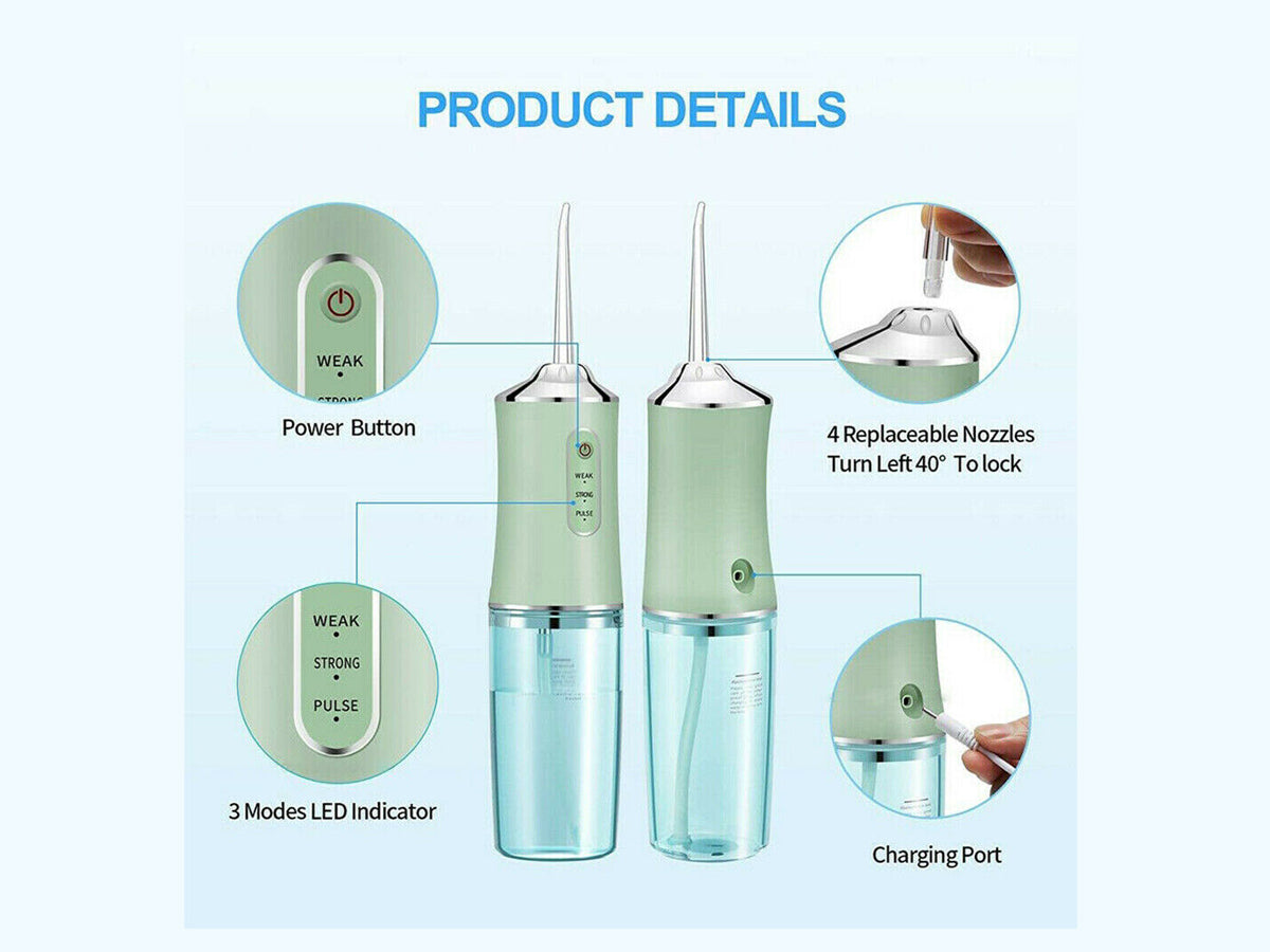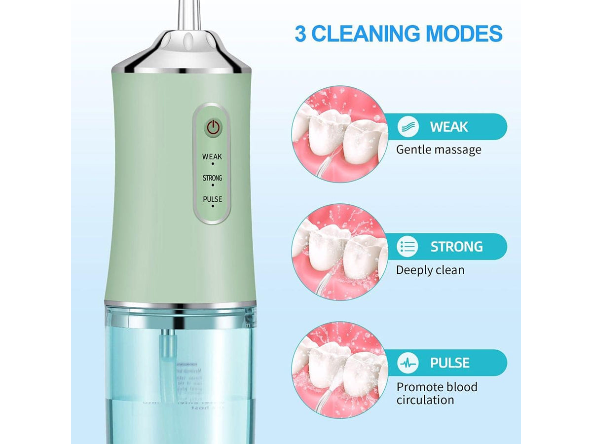 IPX7 waterproof design is adopted for both internal and external of the machine to provide dual protection, which prevents leakage and allows the Water Flosser to be used safely for shower in the bathroom. Our Water Flosser has 3-speed modes (Weak/Strong/Pulse), a large capacity 1000mAh battery which can last 20 days if used 5 mins. daily.