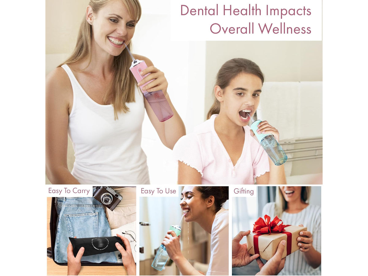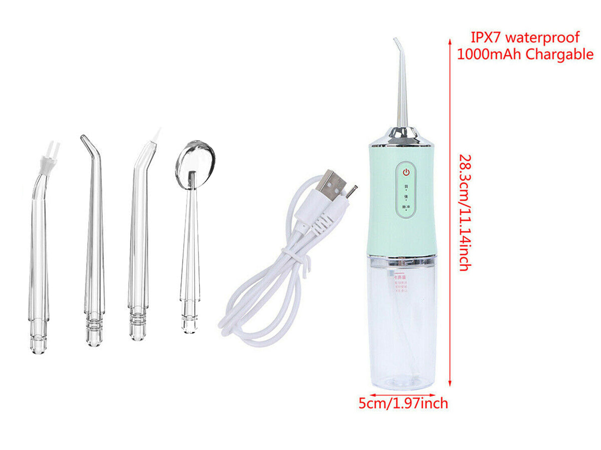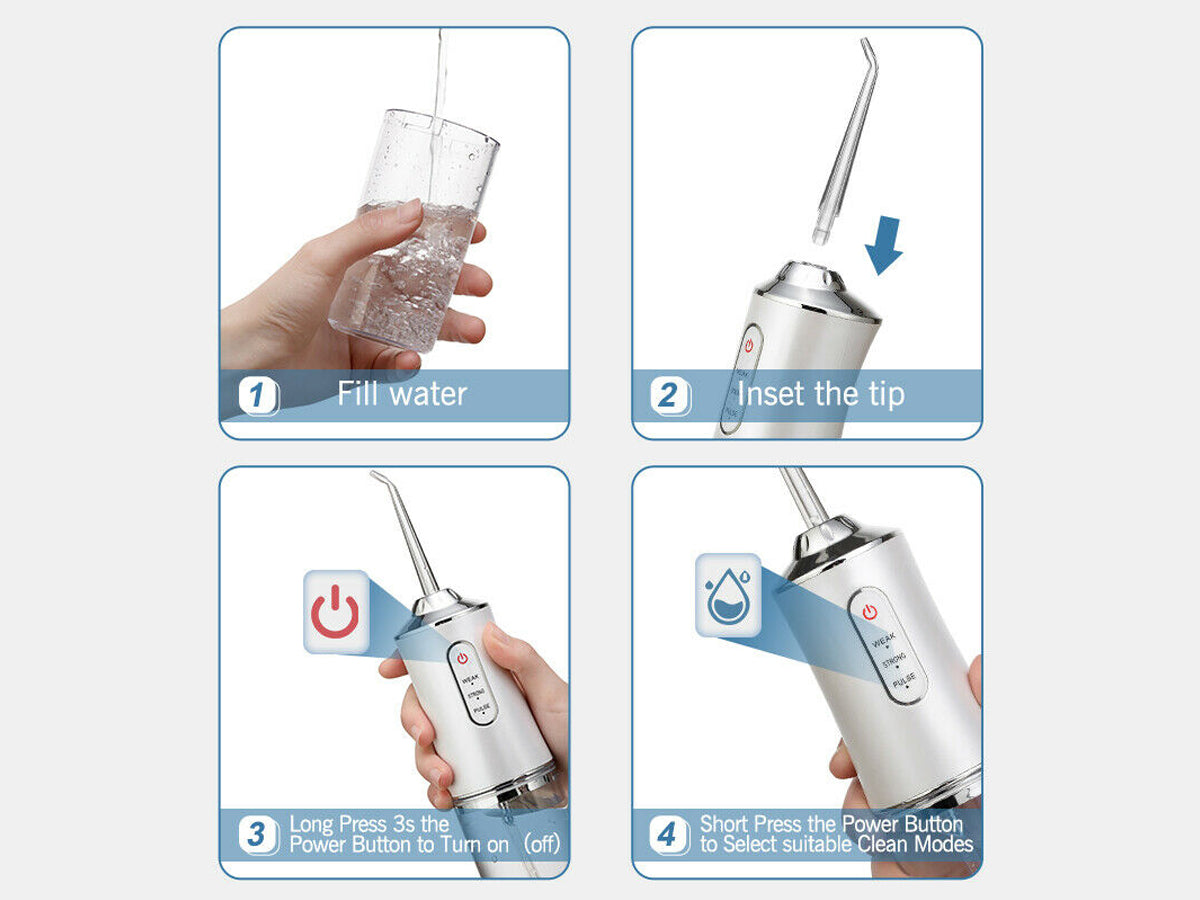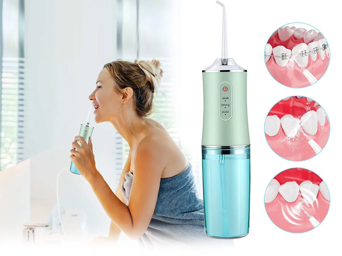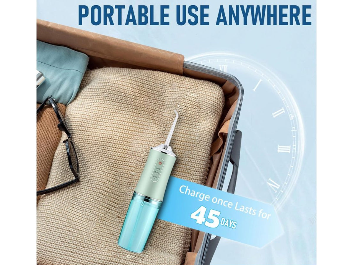 IPX7 waterproof design is adopted for both internal and external of the machine to provide dual protection, which prevents leakage and allows the Water Flosser to be used safely for shower in the bathroom. Our Water Flosser has 3-speed modes (Weak/Strong/Pulse), a large capacity 1000mAh battery which can last 20 days if used 5 mins. daily.