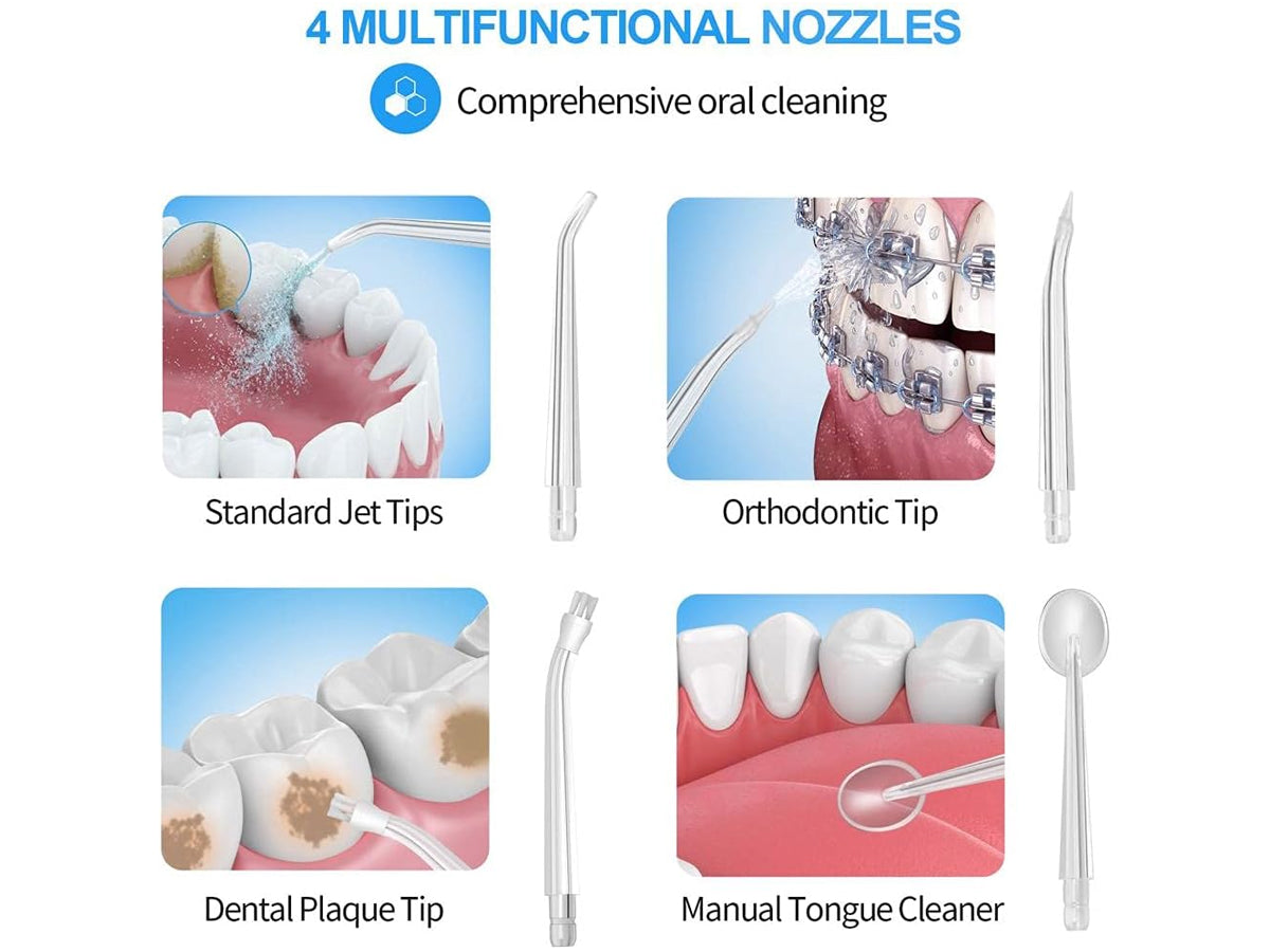 - Nozzles: 4 Pcs (2 standard nozzles, 1 orthodontic nozzle, 1 tongue scraper)