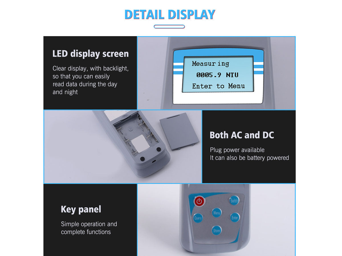 The Dual Powered Portable Turbidity Meter is a reliable and versatile device designed for precise measurement of turbidity levels in water. With its dual power options of plug-in and AA batteries, this Portable Turbidity Meter ensures convenient usage in various settings. Featuring a Water Quality Tester Turbidity Meter with a backlight LCD display, it provides clear and easy-to-read results. Its 90° scattered light measurement method ensures accuracy and reliability.