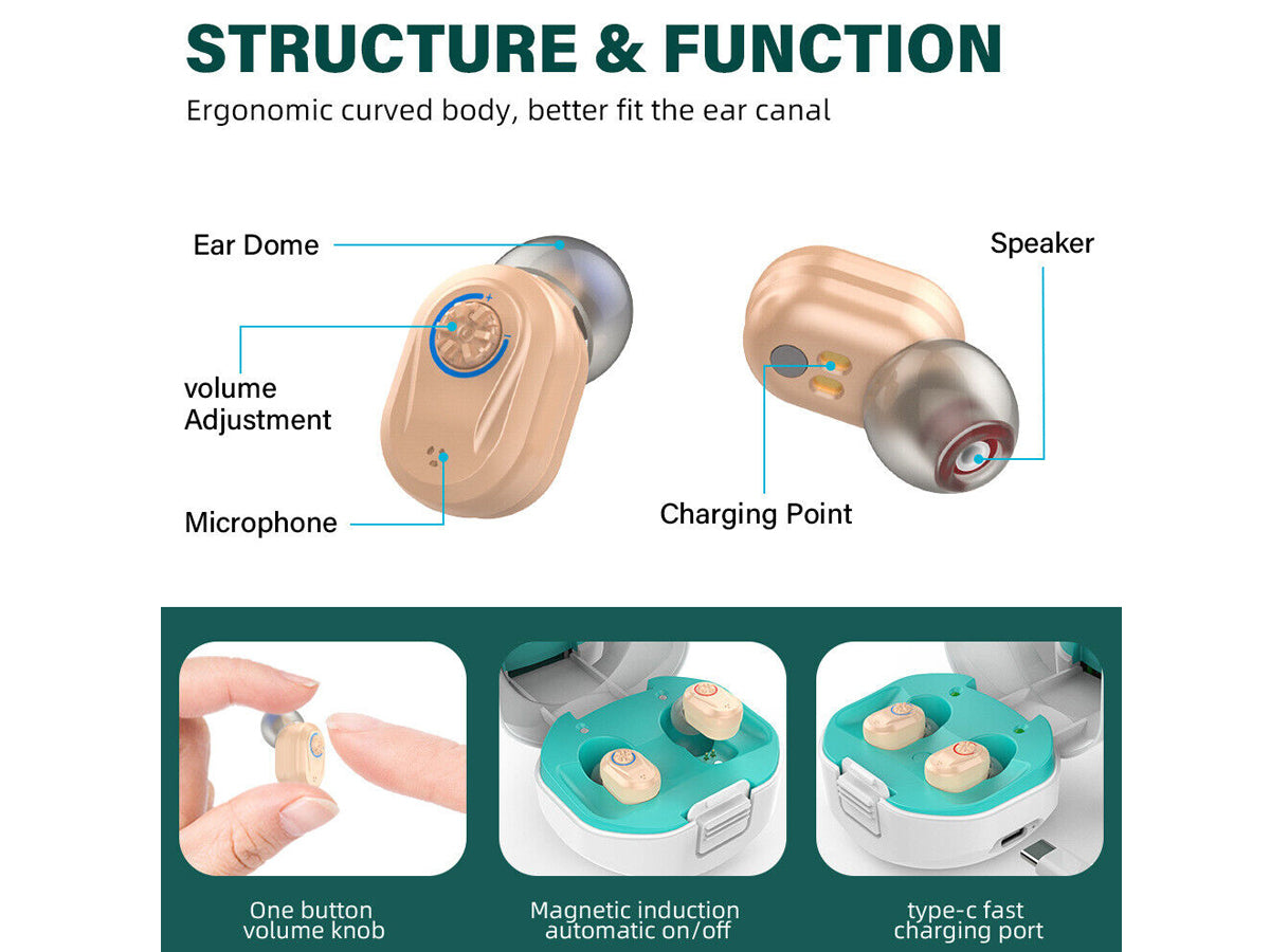 Experience crystal clear sound with our Wireless Rechargeable Hearing Aids with Battery. Its intelligent noise reduction technology filters out unwanted background noise, providing you with high-quality sound. The small and ergonomic design ensures a comfortable and discreet fit in your ear, making it perfect for indoor, outdoor, sports, and meeting activities. Regain your confidence with our hearing aid that comes with a charging case for easy recharging anytime, anywhere.