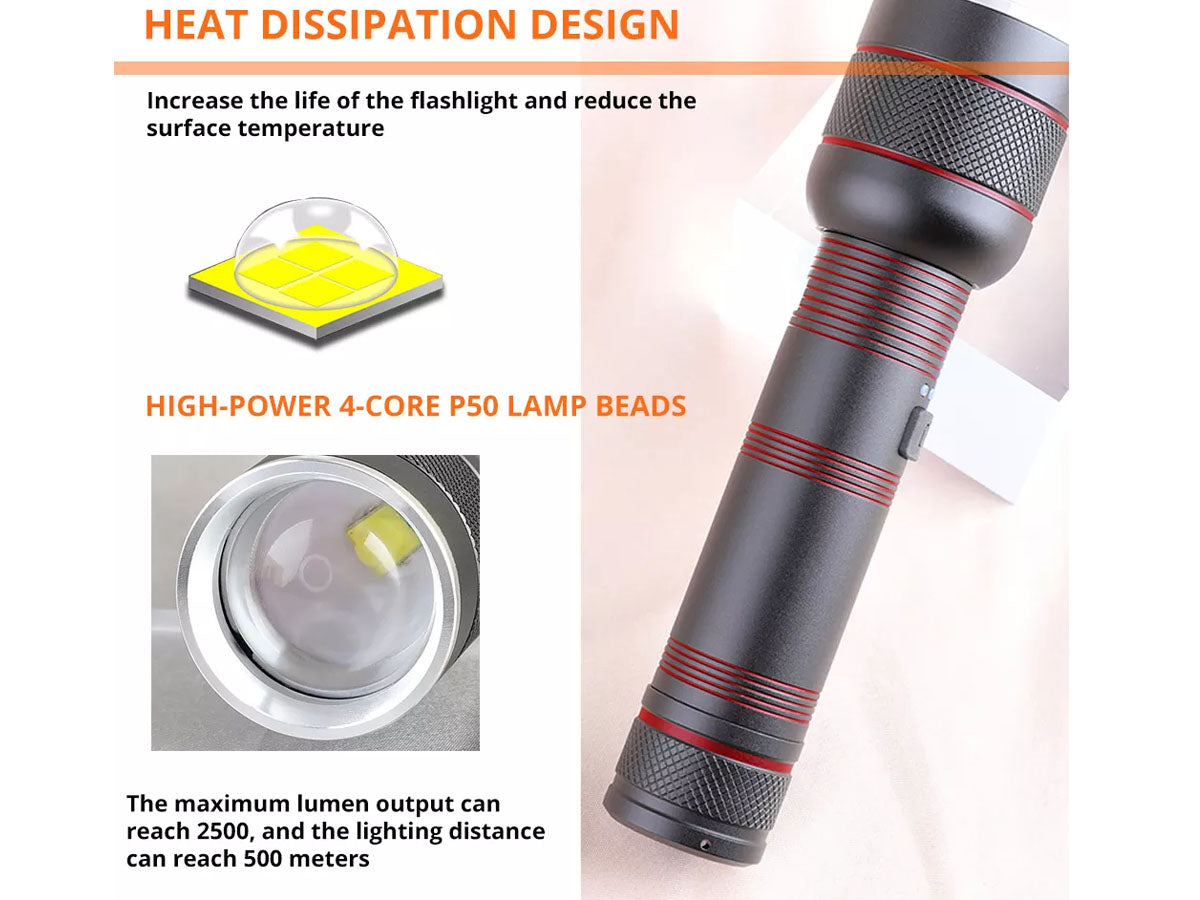 This Rechargeable Torch with Long-Range Illumination up to 500m and 1500 Lumen output are brighter than traditional flashlights. This Rechargeable Torch with a 1-4x zoom function can focus on objects or zoom out to sweep a large area by rotating the flashlight head. This Rechargeable Torch has four lighting modes strong light, medium light, low light, and Strobe-SOS helps you in different conditions.