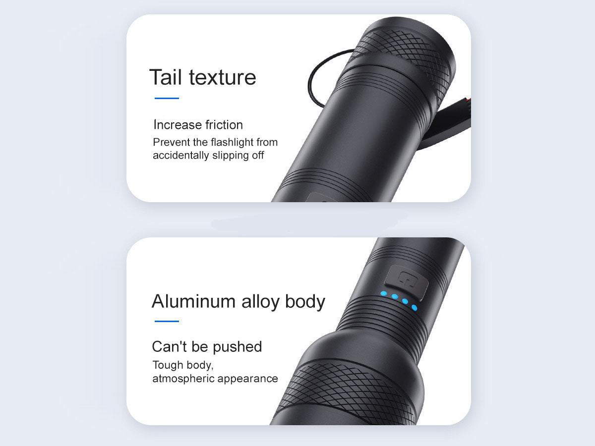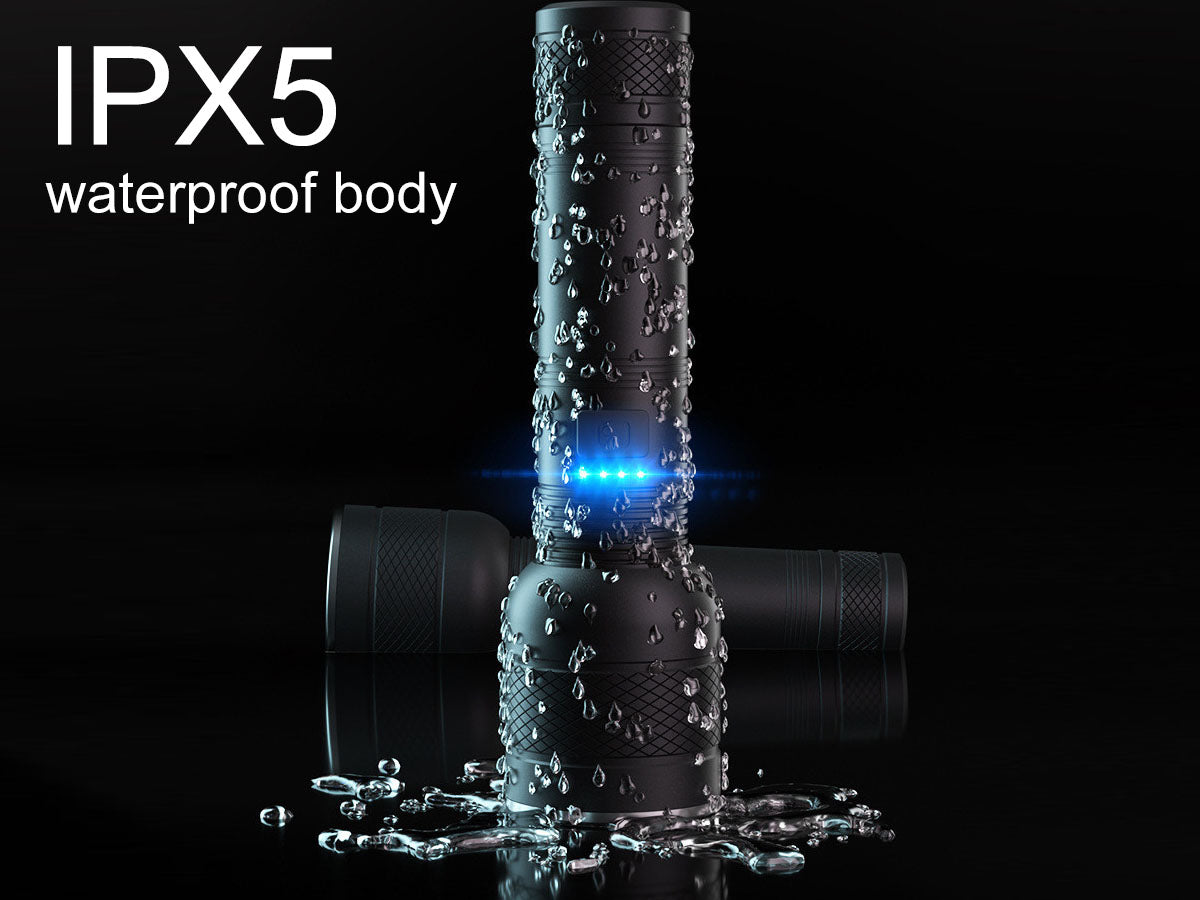 This Rechargeable Torch with a built-in 18650 rechargeable battery and 4 power indicator lights (25%-50%-75%-100%), notifies you to charge early. This Waterproof Rechargeable Torch is perfect for the outdoors, good for search missions, routine patrol and cave exploration, etc.