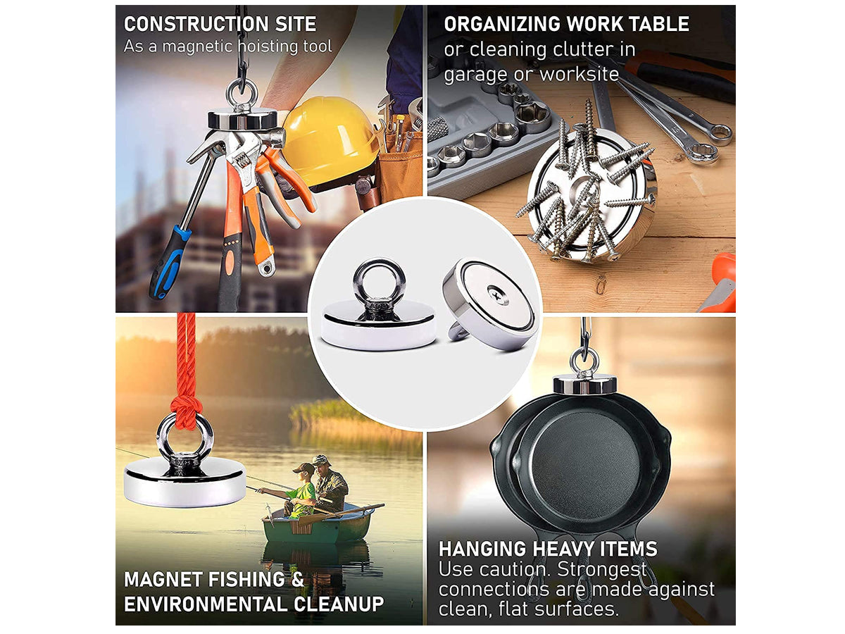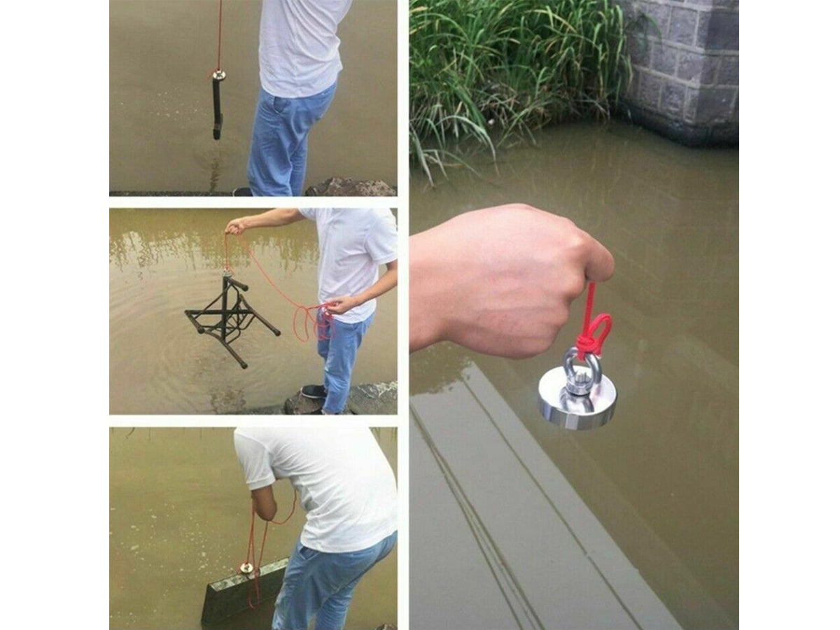 Designed for heavy-duty and underwater applications, ideal for fishing, lifting, or retrieving lost ferrous objects underwater, eg water pump, ferrous tools, old objects. It can also be used to hold or fix garage or yard items such as eye bolts, screws, hooks, fasteners, adsorption, or anywhere you need an incredibly strong magnet