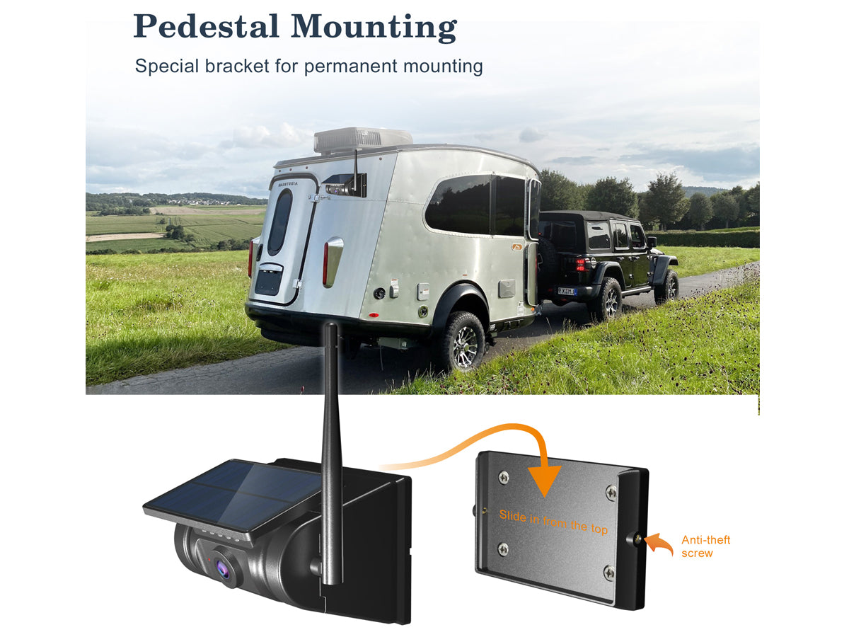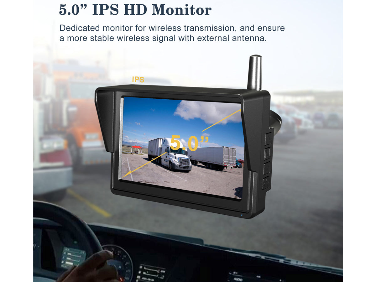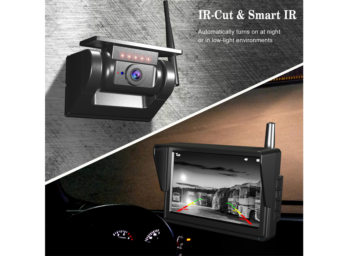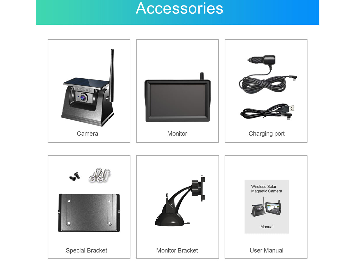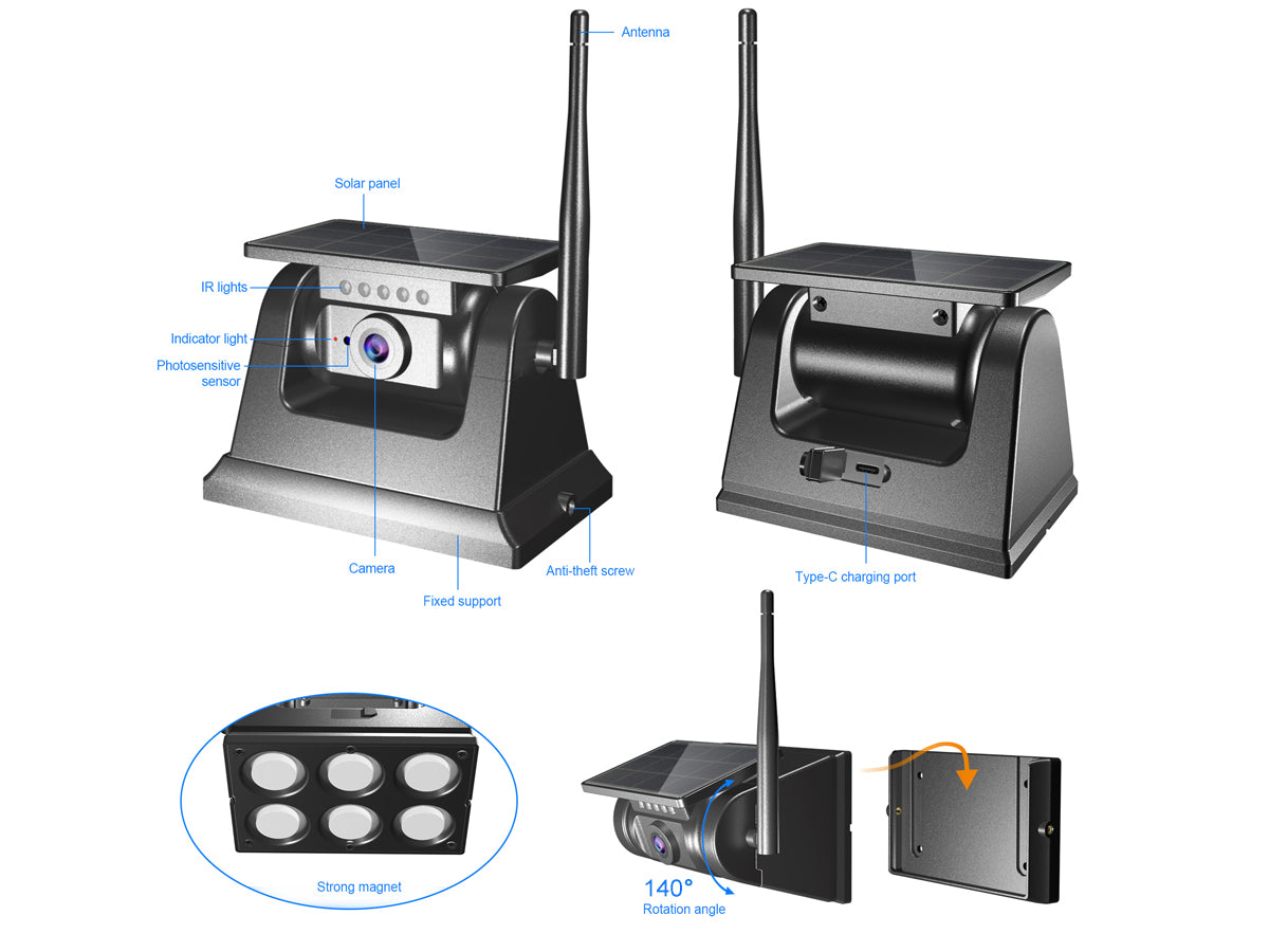 Enhance your driving safety with our 5-inch Solar Magnetic Wireless Reversing Camera. This advanced system offers wireless transmission, solar and type-C charging, a 10000mAh battery, an IP68 waterproof rating, a 140° wide viewing angle, an Anti-loss function with an alarm, IR-CUT and Smart IR for automatic night, ensuring superior visibility and easy installation for safe reversing.