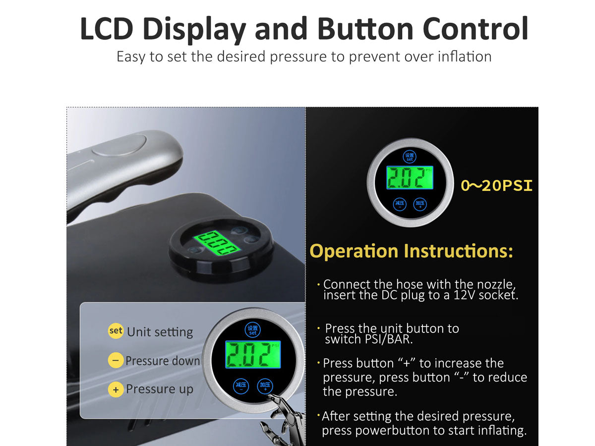 The portable electric paddle board pump is equipped with a smart digital display, you can set the desired target pressure and monitor the pressure in real-time. The supported working range is 0-20 PSI. When the pressure reaches the preset pressure value, the safety intelligent pressure system will automatically stops inflating.