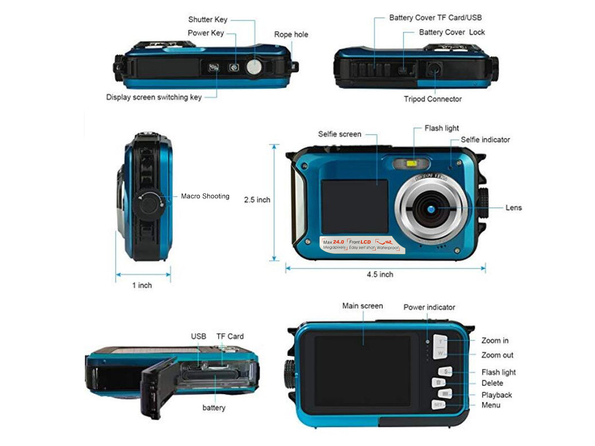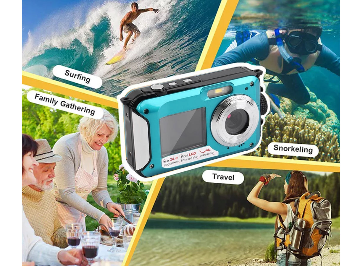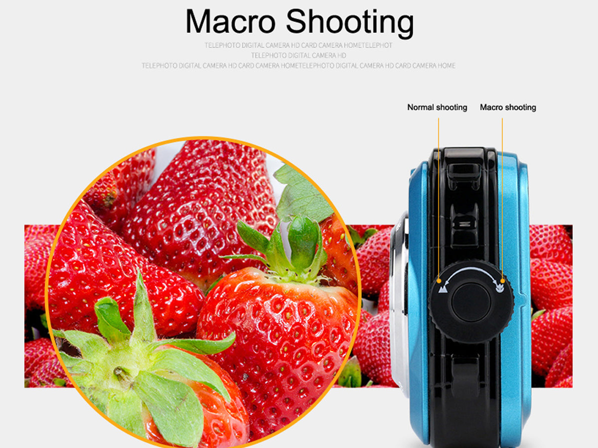 These features enrich 24MP Underwater Digital Camera support vivid video resolution options including 2.7K (20fps) and FHD 1080P (30fps). This Digital Camera with 16X Zoom features a 1.8" front screen and 2.7" rear dual LCD screens, so you can easily record every memorable moment and take a selfie. It also features a focus knob, you can manually set it to be used for Landscape or Macro mode.