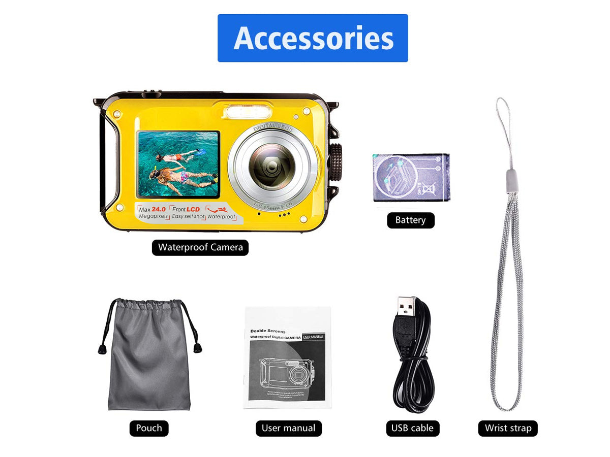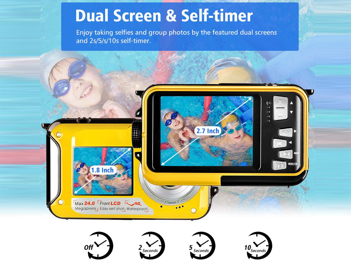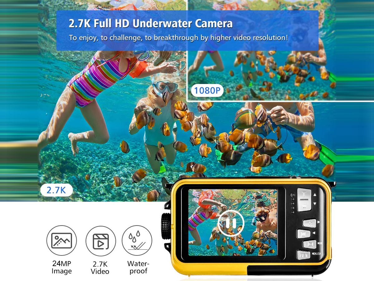 These features enrich 24MP Underwater Digital Camera support vivid video resolution options including 2.7K (20fps) and FHD 1080P (30fps). This Digital Camera with 16X Zoom features a 1.8" front screen and 2.7" rear dual LCD screens, so you can easily record every memorable moment and take a selfie. It also features a focus knob, you can manually set it to be used for Landscape or Macro mode.