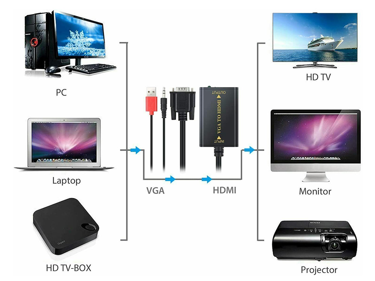 This VGA to HDMI converter can convert the analogue signal coming from your PC into a digital HDMI signal. This VGA to HDMI converter allows you to convert analog VGA output from any laptop/PC to your HDTV which has HDMI port. Our VGA to HDMI converter can make signals of both video and audio from your computer to your TV. VGA to HDMI Converter Share your video/audio/data from computers or old-style laptops or PC that has only VGA port to any HDMI- equipped devices like HDTVs, monitors etc.