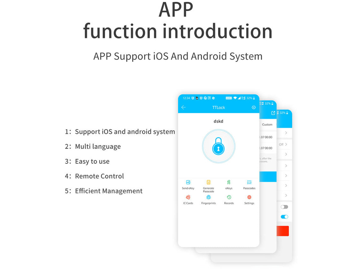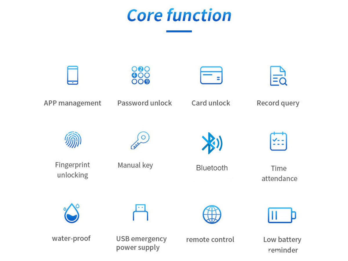 - 6 Unlock Methods: fingerprint, Bluetooth, remote Wifi app unlocking, password, key, and IC card