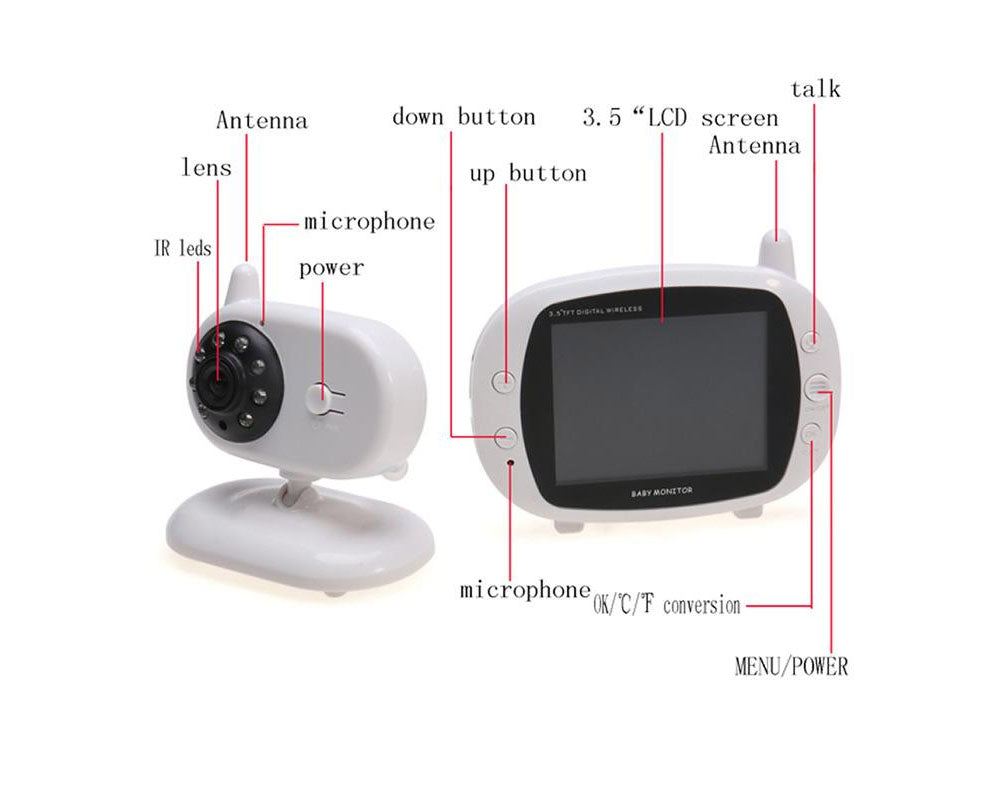 This Baby Monitor is equipped with a camera that wirelessly sends video to the monitor, more stable and smooth audio and video. 3.5-inch high-definition TFT LCD portable design colour display, you can now clearly monitor your baby peace of mind to sleep.