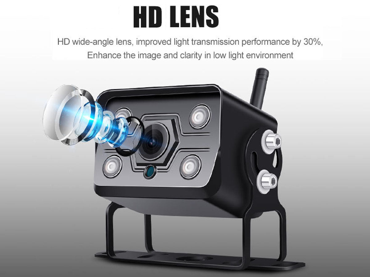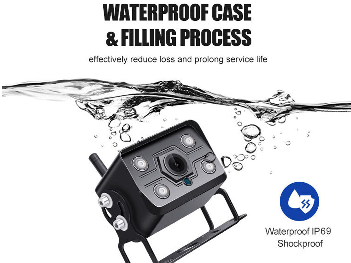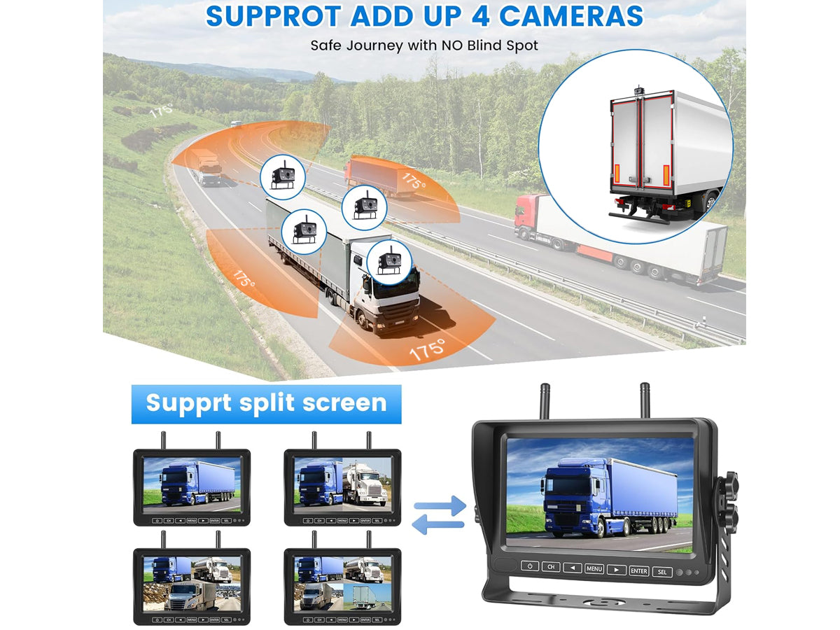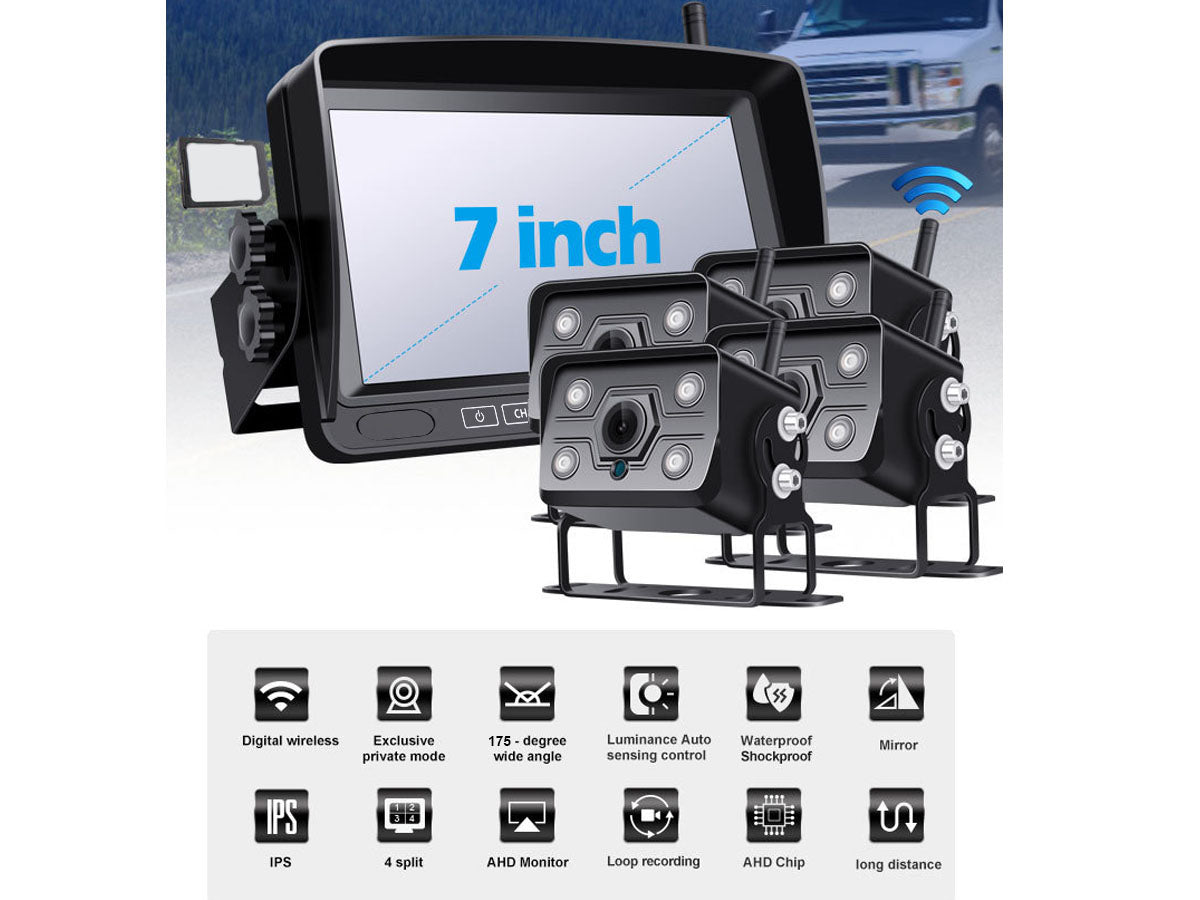 Upgrade your vehicle's safety and convenience with our 7" Wireless Car Reversing Camera Kit. The Car Reversing Camera kit includes a 7" IPS LCD digital screen, delivering stunning 1080P HD resolution with a wide-angle camera (175°). You can connect up to 4 cameras and enjoy split-screen functionality. The auto-dimming and loop recording features further optimize visibility, while the IP69 waterproof, shockproof, and anti-fog camera ensures durability and reliability.