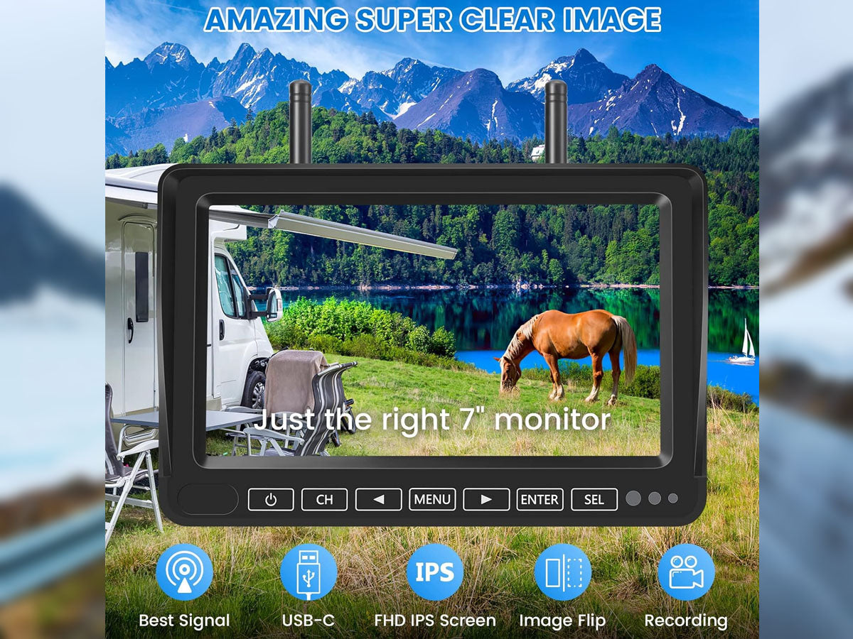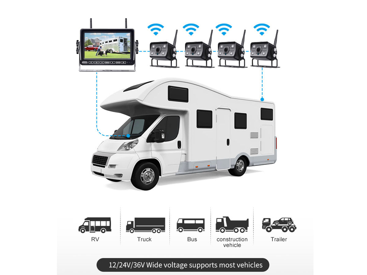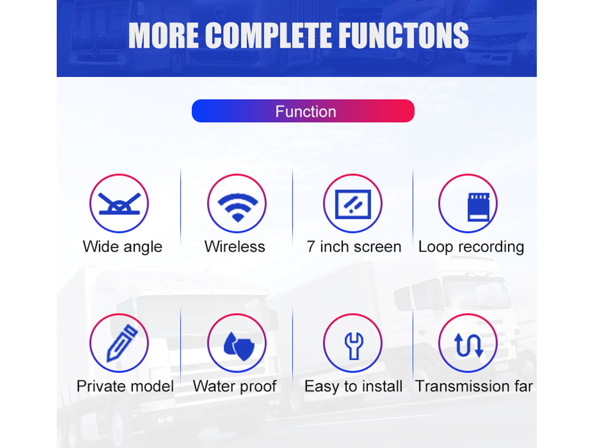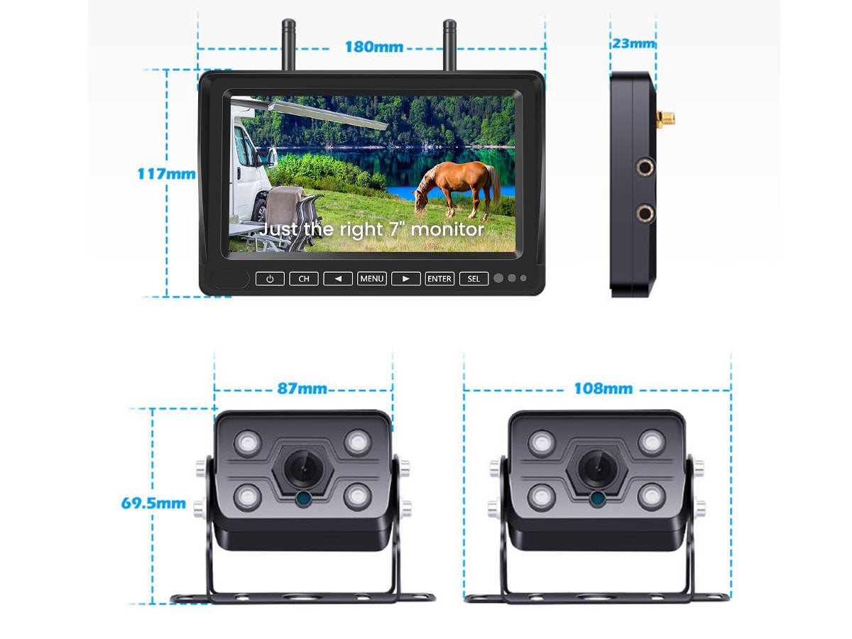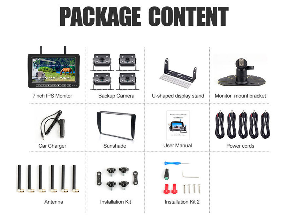 Upgrade your vehicle's safety and convenience with our 7" Wireless Car Reversing Camera Kit. The Car Reversing Camera kit includes a 7" IPS LCD digital screen, delivering stunning 1080P HD resolution with a wide-angle camera (175°). You can connect up to 4 cameras and enjoy split-screen functionality. The auto-dimming and loop recording features further optimize visibility, while the IP69 waterproof, shockproof, and anti-fog camera ensures durability and reliability.
