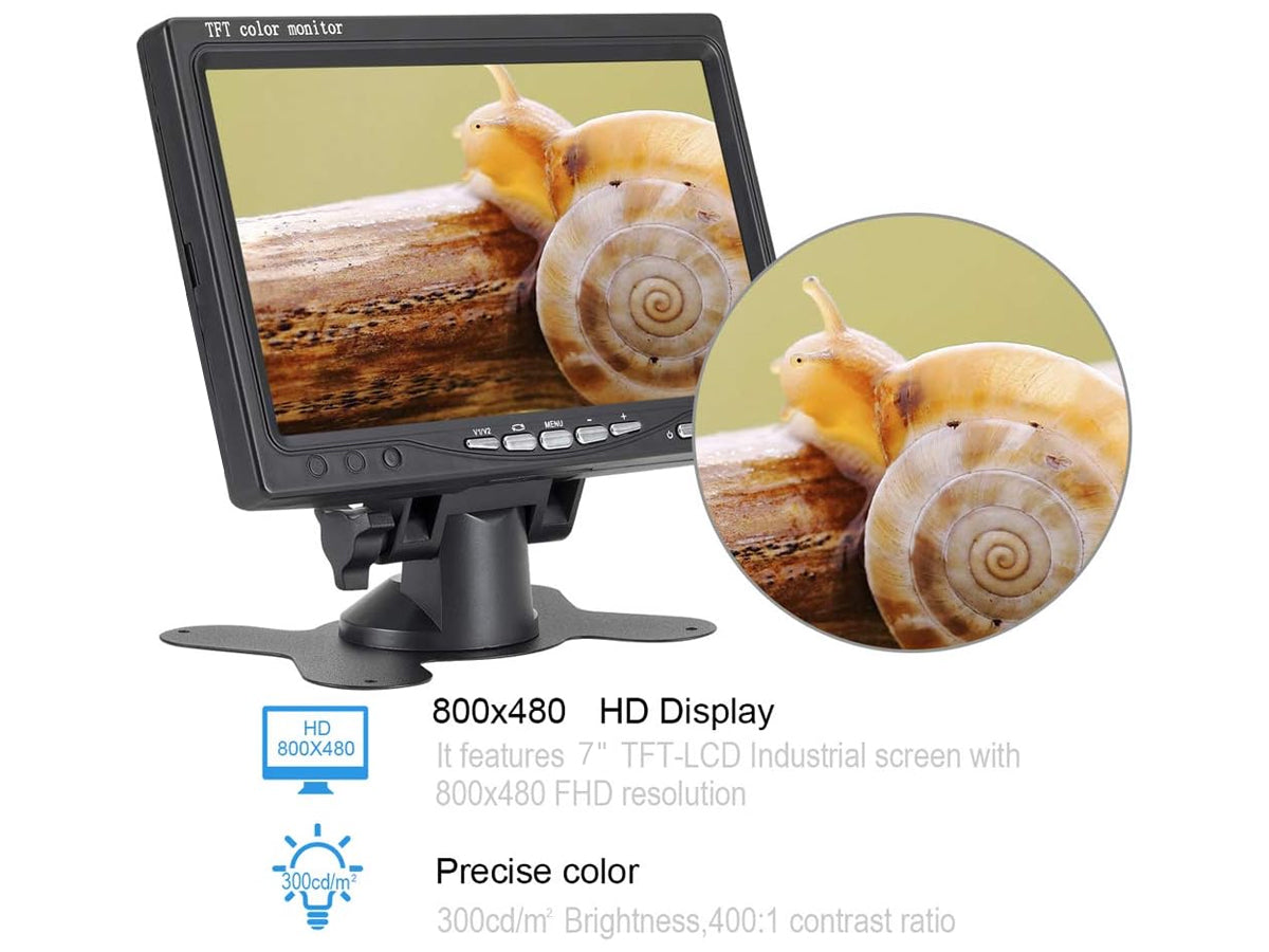 - High-resolution 7" TFT LCD monitor with low power consumption