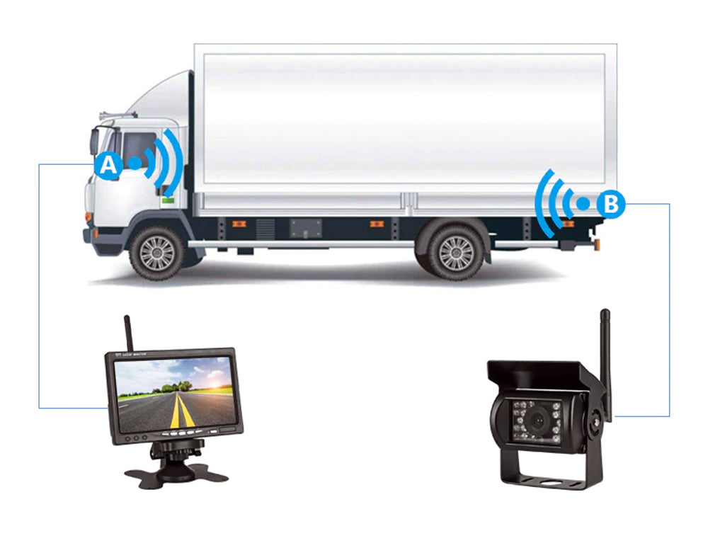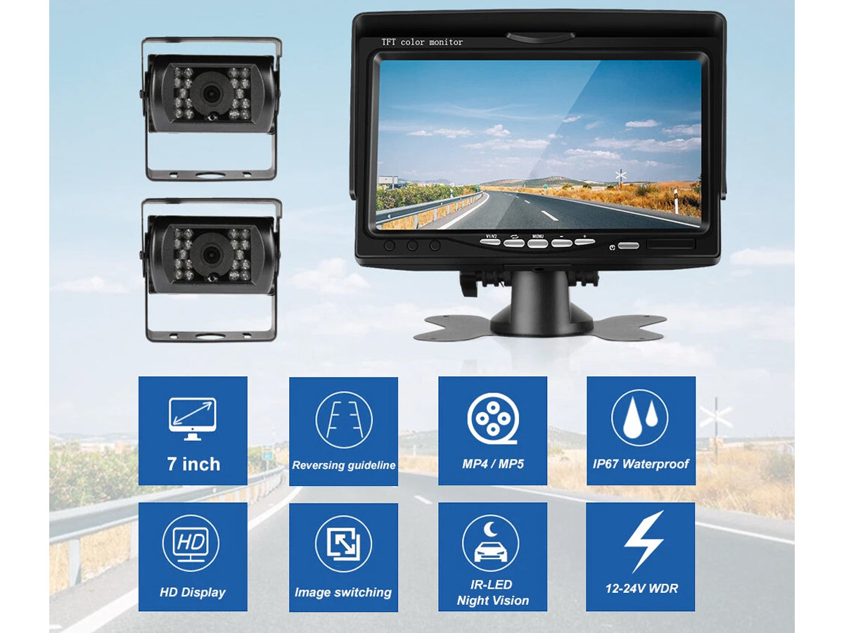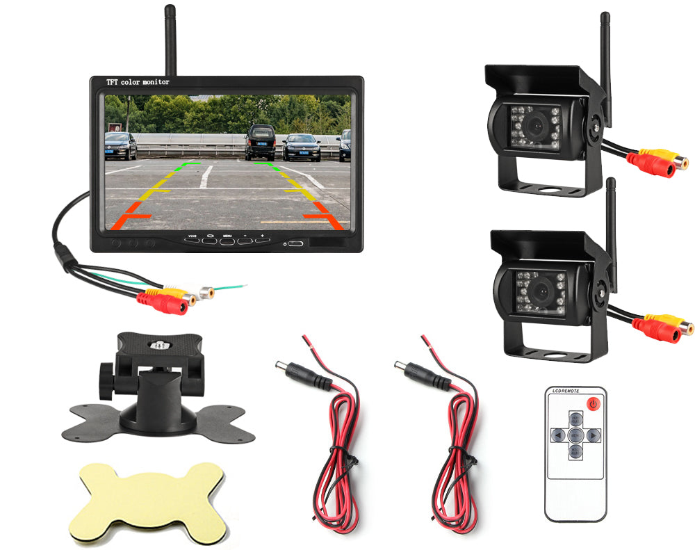 7" TFT LCD wide screen wireless monitor with 2 Wireless Car Reversing Camera. Both cameras are night vision feature, very light weight, waterproof, easy and comprehensive installation, low power consumption and no maintenance is required.