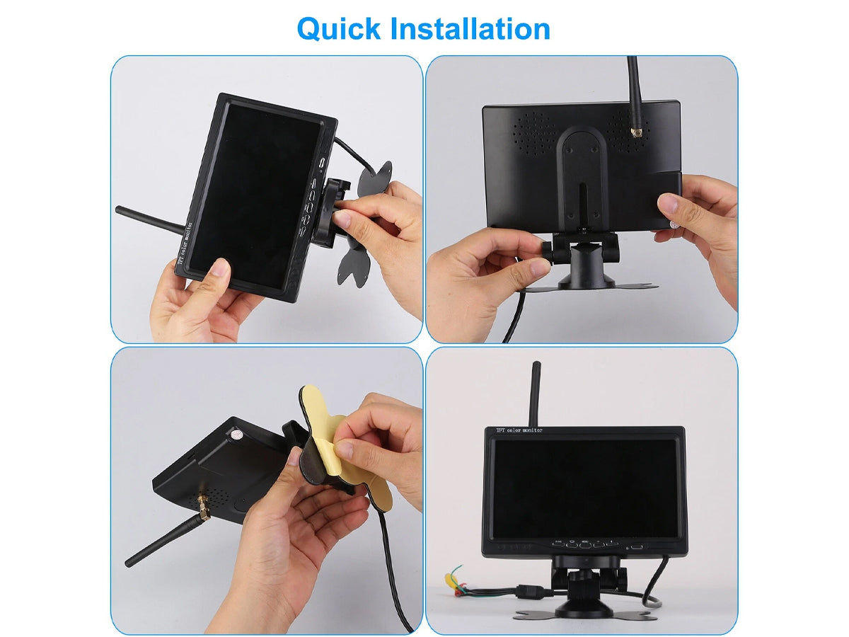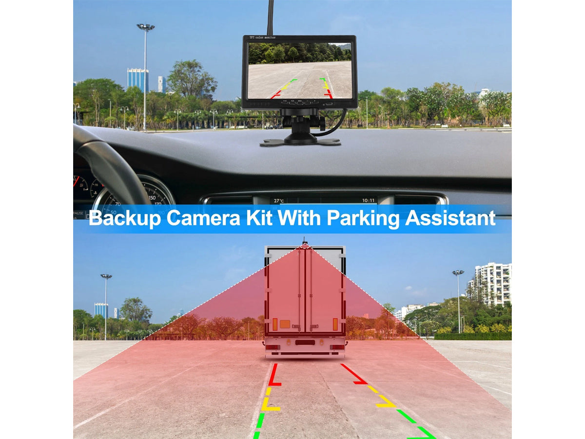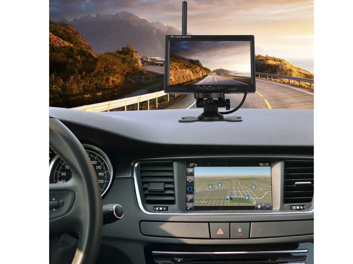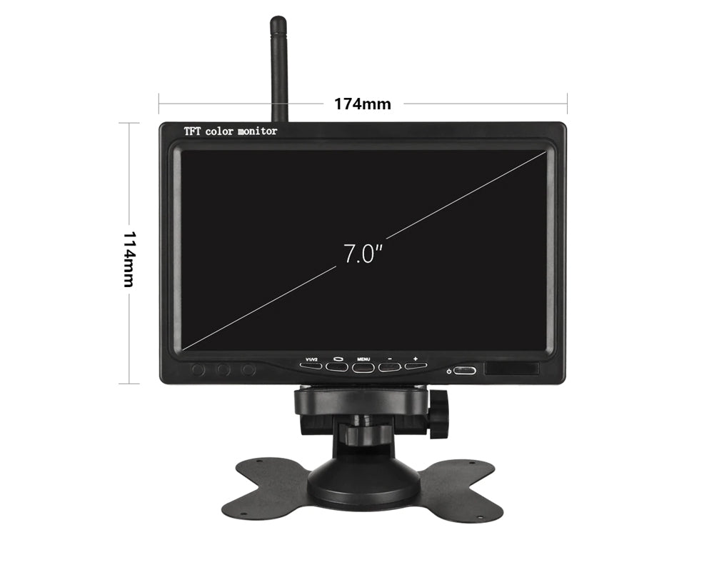 7" TFT LCD WIDE SCREEN WIRELESS MONITOR--Anti-glare high resolution. It will start up automatically, and synchronously display the video from rear view when you're backing or braking your car.