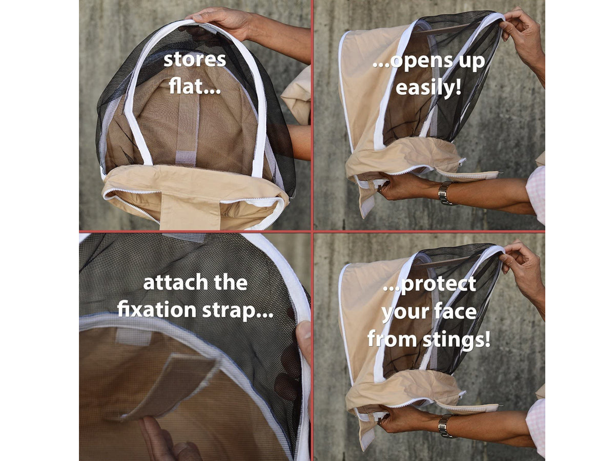 - Attached round veil keeps the bees away